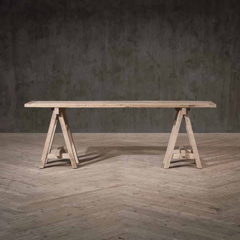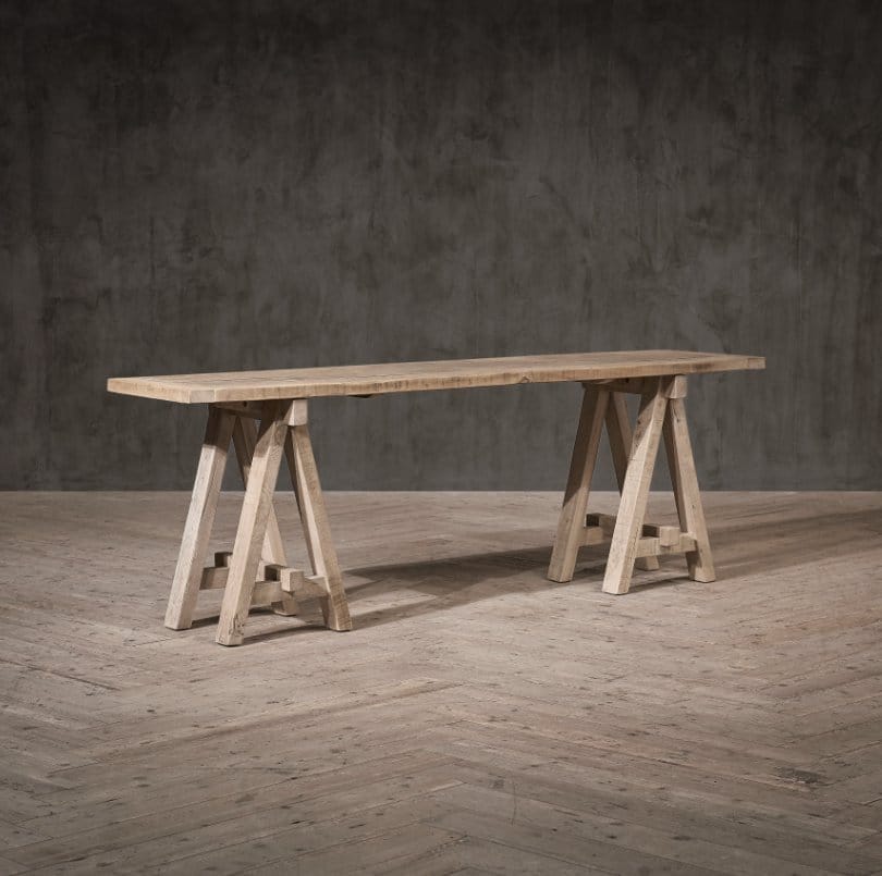 Inspired by our founder Tim Oulton’s beloved A-frame glass acrylic desk used in his family home in France, reinterpreted in one of our favourite materials – reclaimed timber. Lending a strong architectural presence with its crisp angles, the A-Frame oak console table is handcrafted from century-old oak and constructed by hand with durable mortise and tenon joints. The timber has an authentically distressed patina, rife with the character that only weathering and age can bring. The humble trestle table shape has a rich history of use from schools to science labs to decorating tables to banqueting tables, with its simplicity of design enduring through the years.