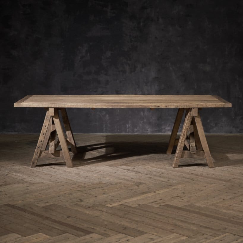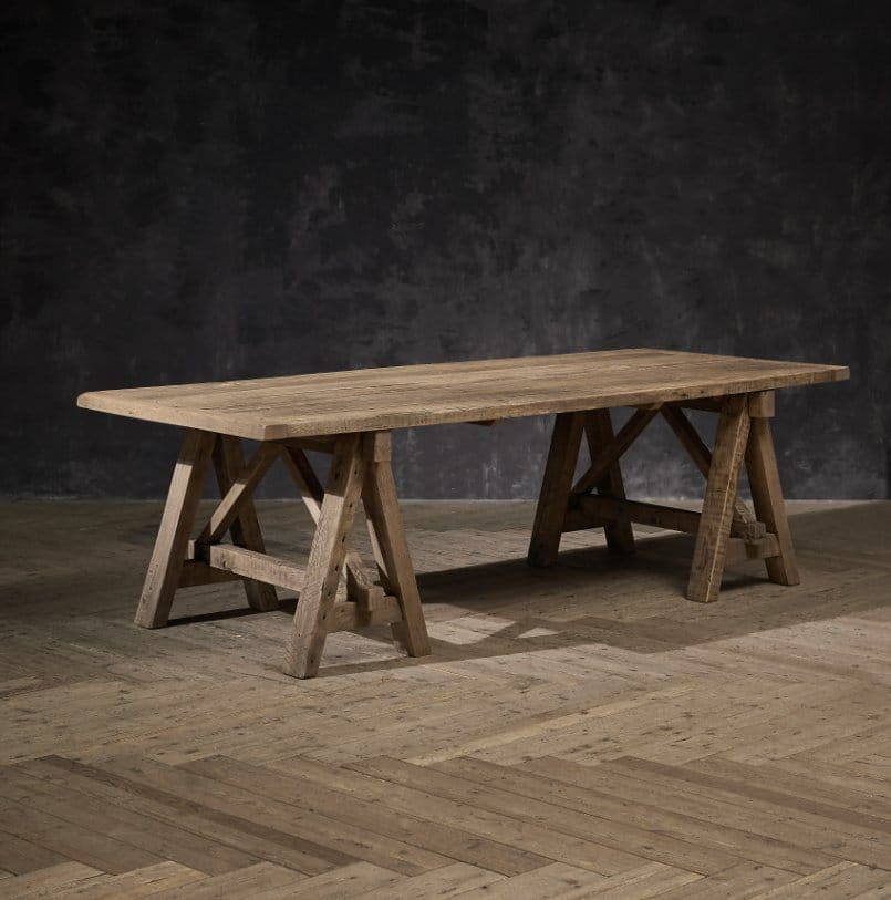 Inspired by our founder Tim Oulton’s beloved A-frame glass acrylic desk used in his family home in France, reinterpreted in one of our favourite materials – reclaimed timber. Lending a strong architectural presence with its crisp angles, the A-Frame oak dining table is handcrafted from century-old oak and constructed by hand with durable mortise and tenon joints. The timber has an authentically distressed patina, rife with the character that only weathering and age can bring. The humble trestle table shape has a rich history of use from schools to science labs to decorating tables to banqueting tables, with its simplicity of design enduring through the years.
