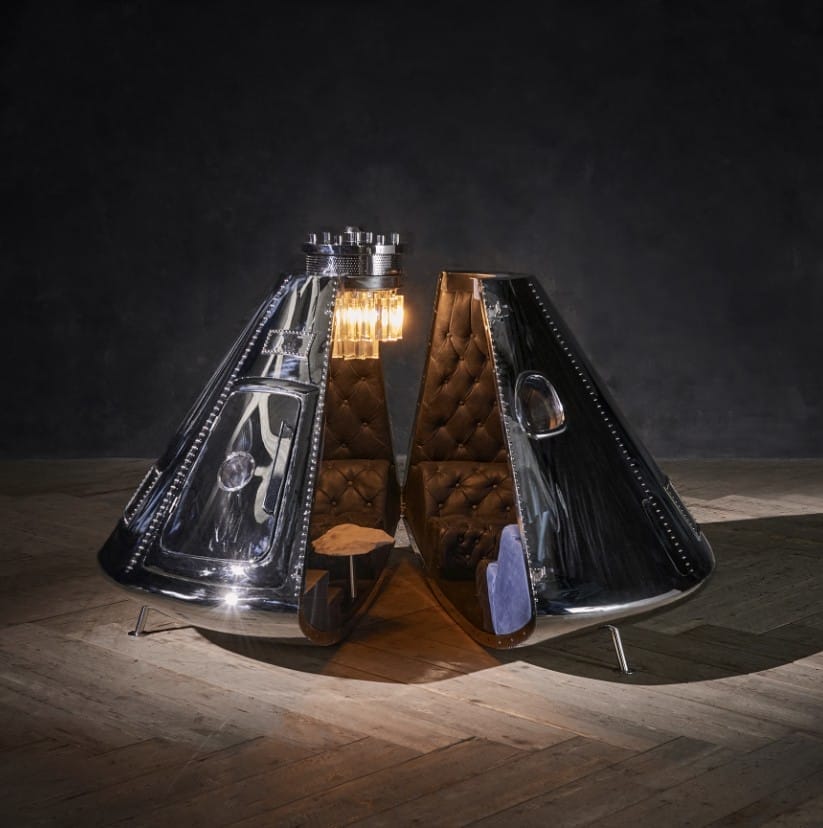 The moon landing represents an iconic moment in history where man achieved the impossible. The Mini Apollo is a scaled down version of our signature Apollo spaceship designed by Timothy Oulton Studio, symbolic of our journeys through time and space in search of inspiration. Made in-house by our team of skilled craftsmen, the Mini Apollo stands at 1 metre high with a diamter of 136cm at its widest point. It features an exterior in polished stainless steel and bespoke interior clad in hand-tufted Bull leather with mini banquette seating, timber flooring in Ebony finish, small Alabaster table, and Odeon pendant.