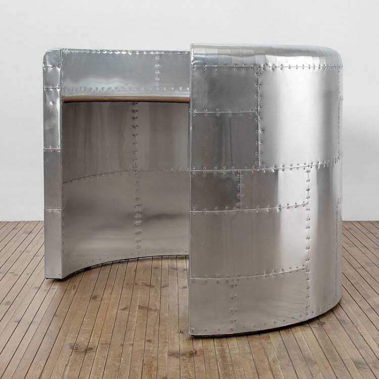 Ready to roar into action, the Cowling desk is inspired by the metal covering on an aircraft engine. Its bold curved lines are clad in Spitfire; our painstakingly handcrafted signature finish. Mimicking the multi-riveted panels on the historic British Spitfire fighter plane, each piece of aluminium is fixed by hand-applied nails and then put through a five stage finishing process to create the impression of worn, distressed metal. The Aviator Cowling desk wraps around you like a pilot in their cockpit, with its moon shaped desk top providing a formidable platform to direct your thoughts.