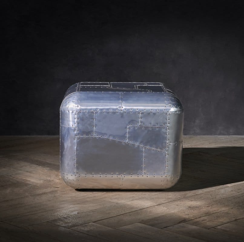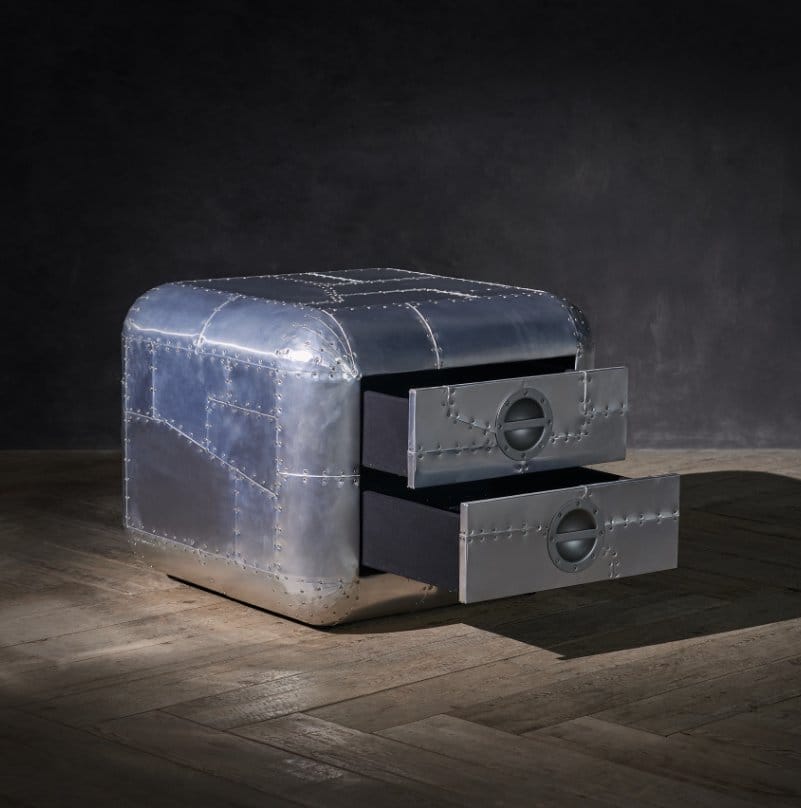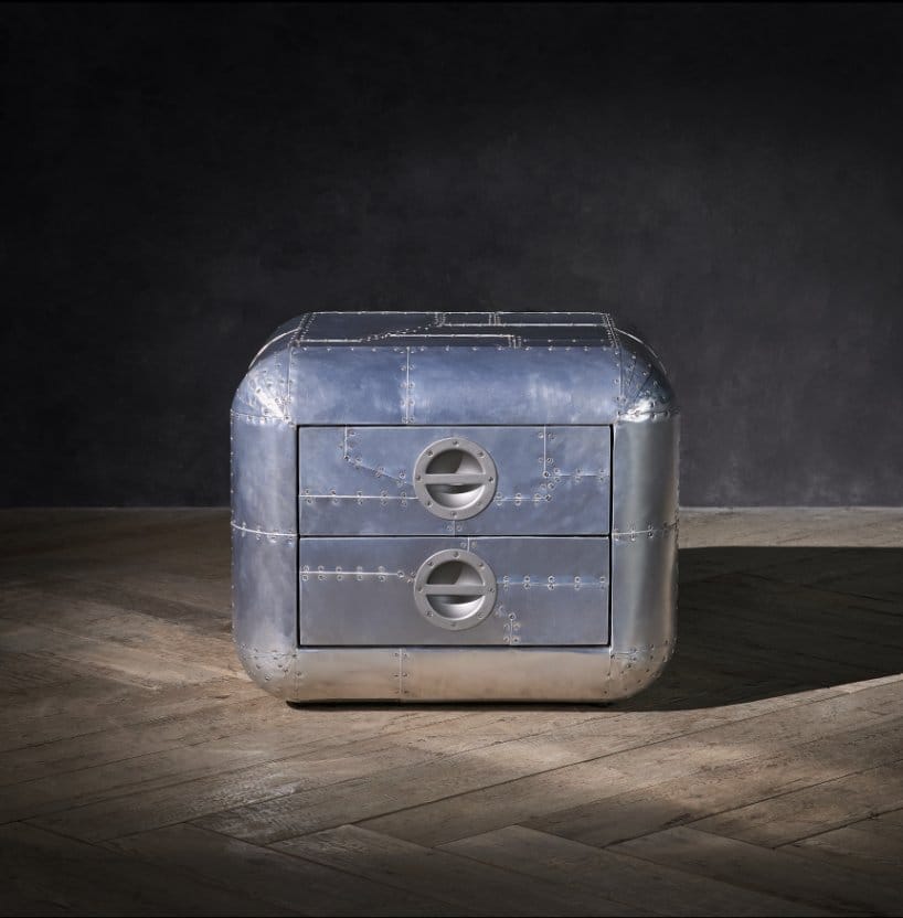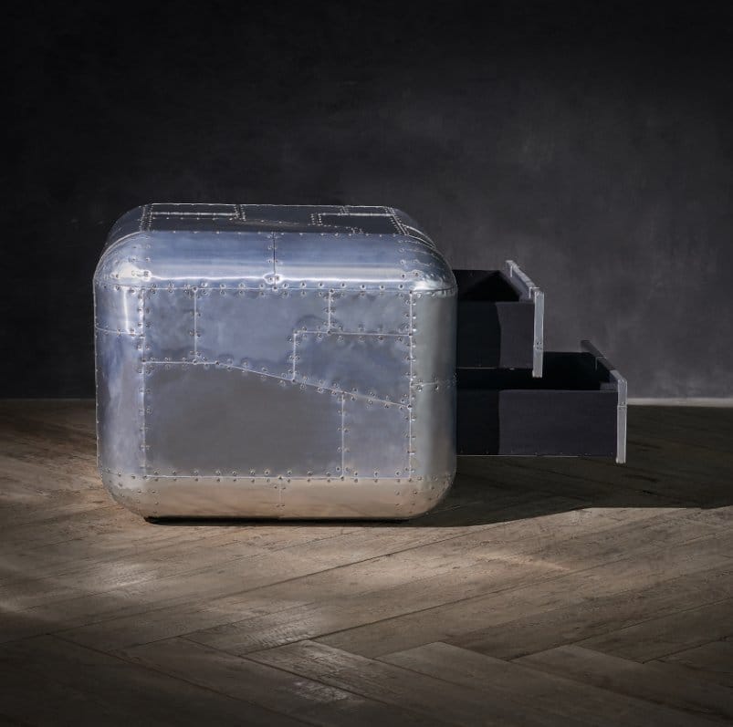 The Aviator Blackhawk collection is an industrial-style range inspired by two different military aircraft, melded together in one awesome piece of craftsmanship. The rounded edges and unique drawer handles of the Aviator Blackhawk side table are reminiscent of the curved lines of the famous Black Hawk helicopter while the Spitfire finish takes its cue from the historic Spitfire fighter plane. Echoing the Spitfire’s multi-riveted construction of interlocking aluminum panels, the metal is put through a five-stage finishing process to create an impression of worn, distressed metal. Please note, the Spitfire finish features surface distress variations, which may vary from piece to piece.