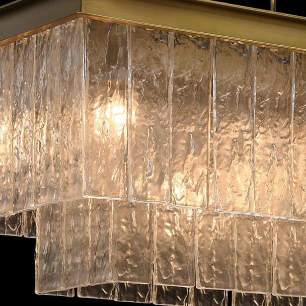 The elegant geometry of Art Deco meets the soothing tones of nature in the Bark pendant. 261 hand-polished prisms of cast glass are textured with a rippled tree bark effect, arranged in stepped concentric rows and anchored by a matt brass frame. A softer, subtler take on glamour for a more laid-back, natural feel. Available as a square, round or rectangular pendant.