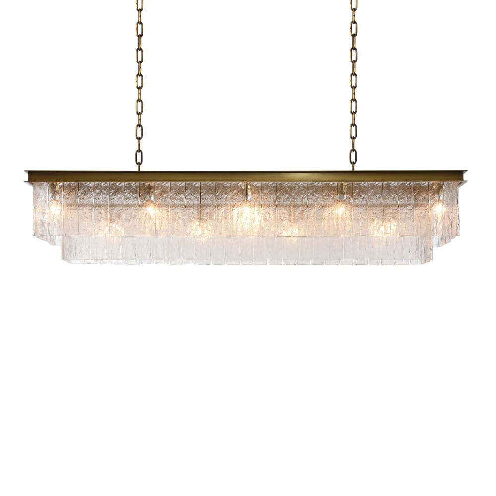 The elegant geometry of Art Deco meets the soothing tones of nature in the Bark pendant. 261 hand-polished prisms of cast glass are textured with a rippled tree bark effect, arranged in stepped concentric rows and anchored by a matt brass frame. A softer, subtler take on glamour for a more laid-back, natural feel. Available as a square, round or rectangular pendant.