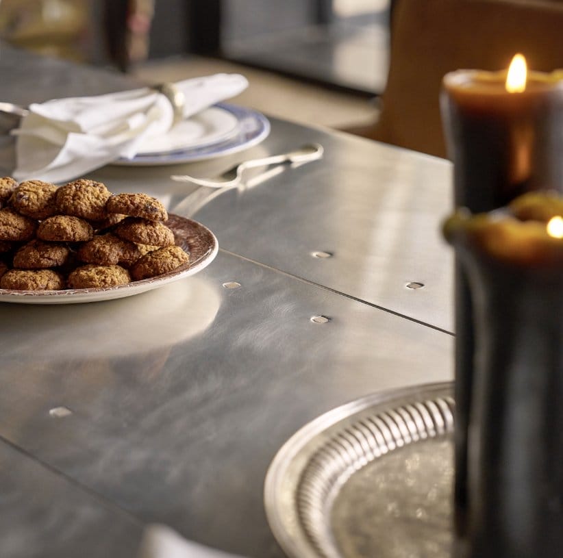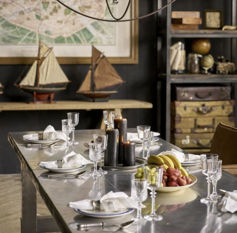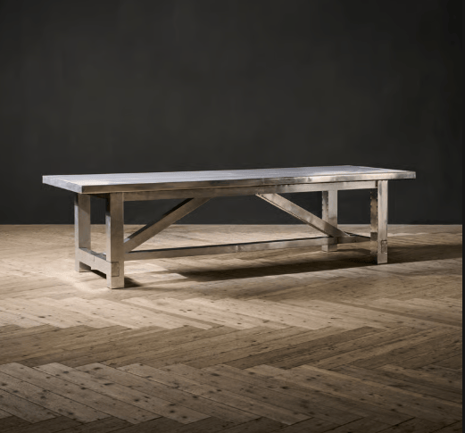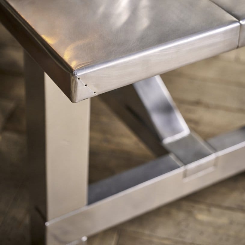 The distressed aluminium finish in Vintage Aero gives a modern twist to the classic silhouette of a 17th century refectory table, combining an architectural shape with unexpected materials. Underneath its industrial persona, Boston retains its traditional refectory hallmarks with a practical stretcher base and simple, effortless lines.