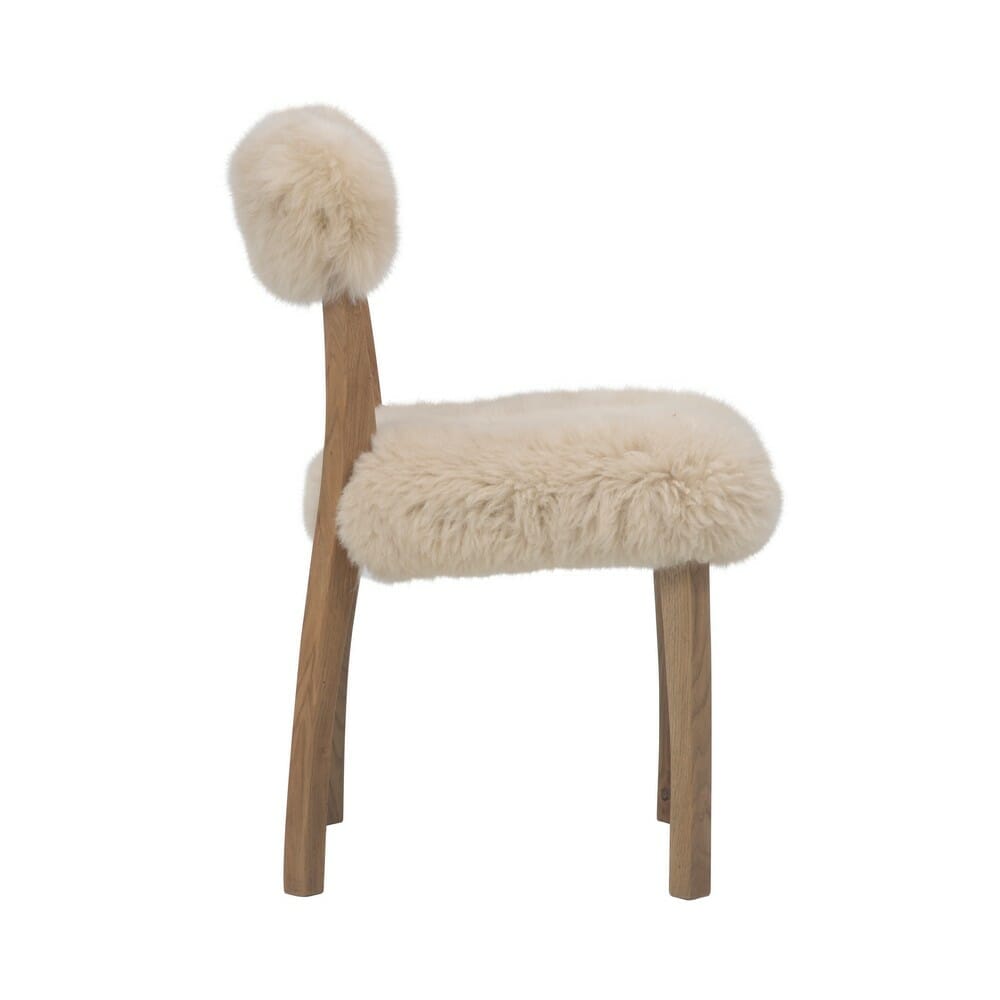 A real conversation starter at the dinner table, the Cabin dining chair is wildly inviting. Ultra-soft and shaggy New Zealand sheepskin adds warmth and texture to your dining space, upholstered by hand onto a weathered oak frame for a luxe, natural look.
