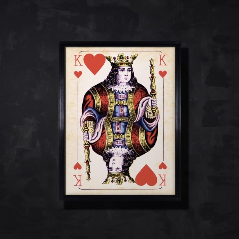 Timothy Oulton’s classic Cards wall art features an enlarged version of vintage playing cards originating from late 19th century Germany, printed with K for König (King), D for Dame (Queen), and B for Bube (Jack). Framed in painted black wood.