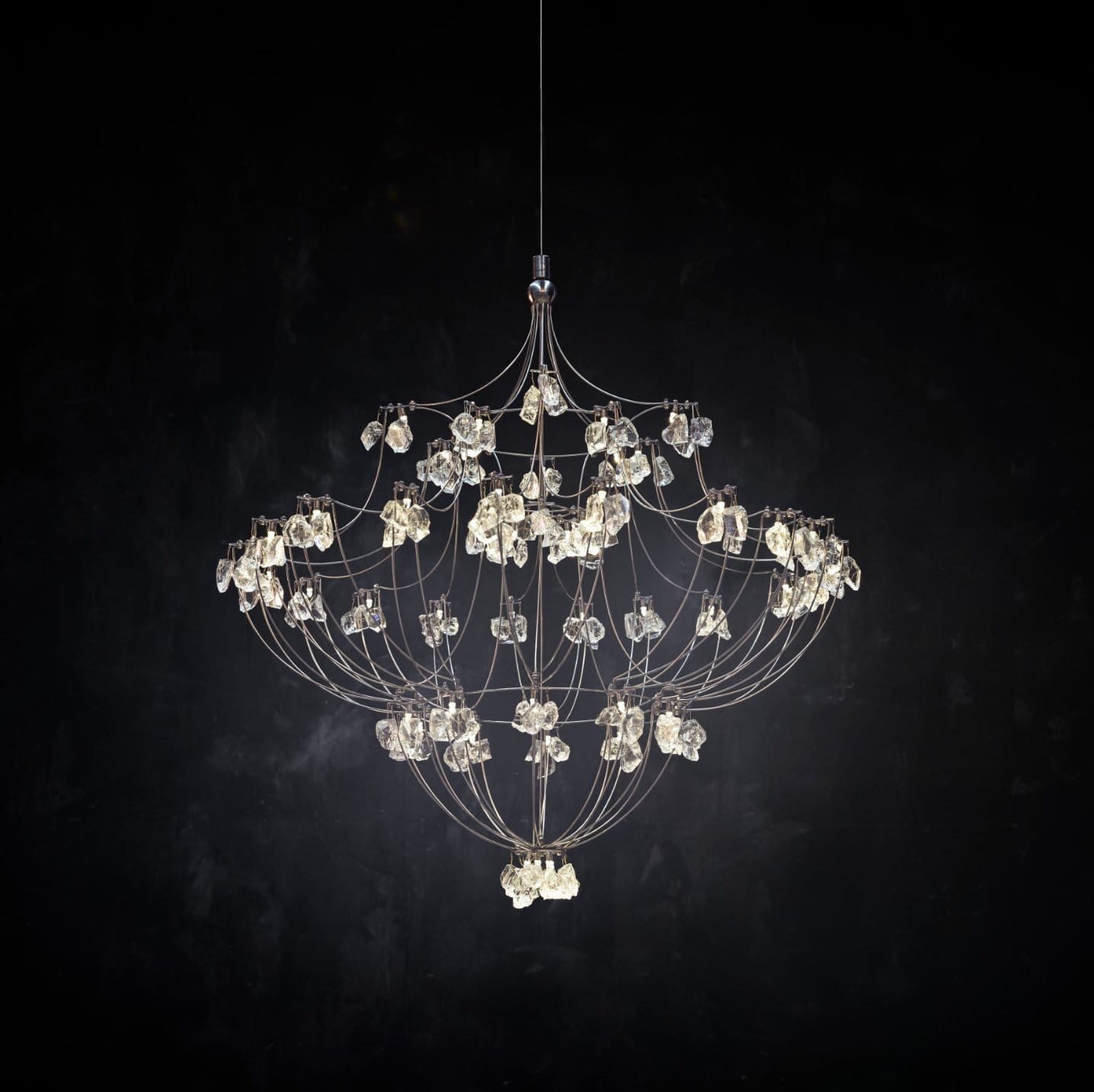 Playing with the DNA of a classic chandelier, the shape of the Classic Volt is outlined by a simple metal wire frame which is also used to transfer power to the bulbs without any need for additional wiring. This allows the chandelier to retain its drama and size whilst simultaneously being incredibly lightweight, and requiring a very low power rating. Clusters of optical glass shards are used in place of traditional candleholders, the clusters are broken and then hand-polished to a smooth finish, with the bulbs placed directly above each cluster to diffuse the light for a soft, romantic effect. A fun and avant-garde play on tradition.