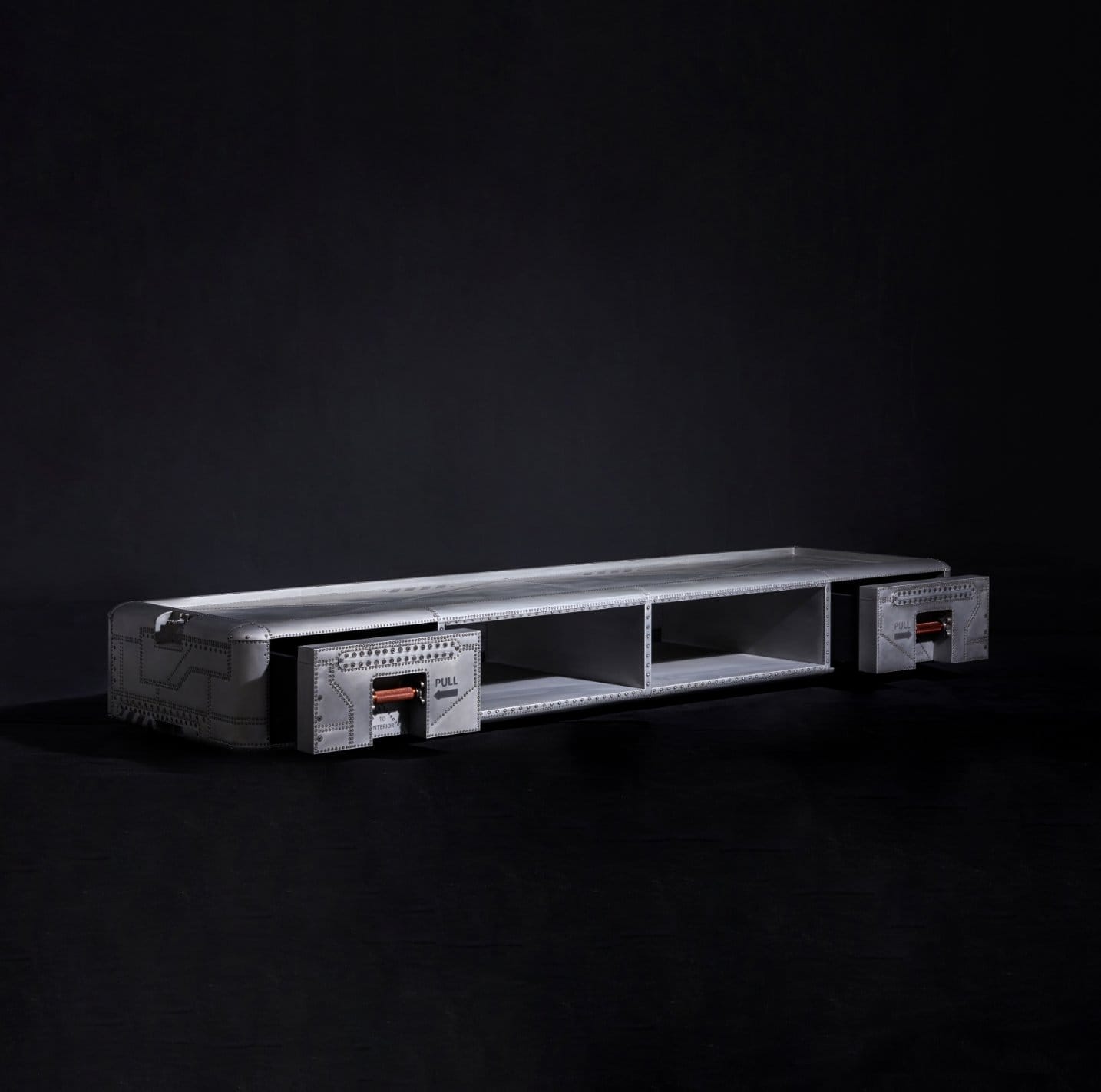 Media unit pictured with side tables and drawers (available separately). Customisable to fit any space, the Cobra modular storage system’s authentic styling is a fusion between the contours of the Bell AH-1 Cobra Advanced attack helicopter and the versatility of military surplus storage units. The curves and overall shapes of the collection were inspired by the AH-1, the first attack helicopter to have a narrow fuselage and long canopy similar a fighter jet to minimise drag and increase speeds, giving the Cobra collection its aerodynamic looks. The ability to stack and lock together, as well as other details such as the handles, was inspired by military surplus containers. These military containers needed to be heavy duty to protect their cargo, and adaptable to different spaces for transport. The Cobra collection mimics this by being able to stack together and create endless combinations to suit any and every space.