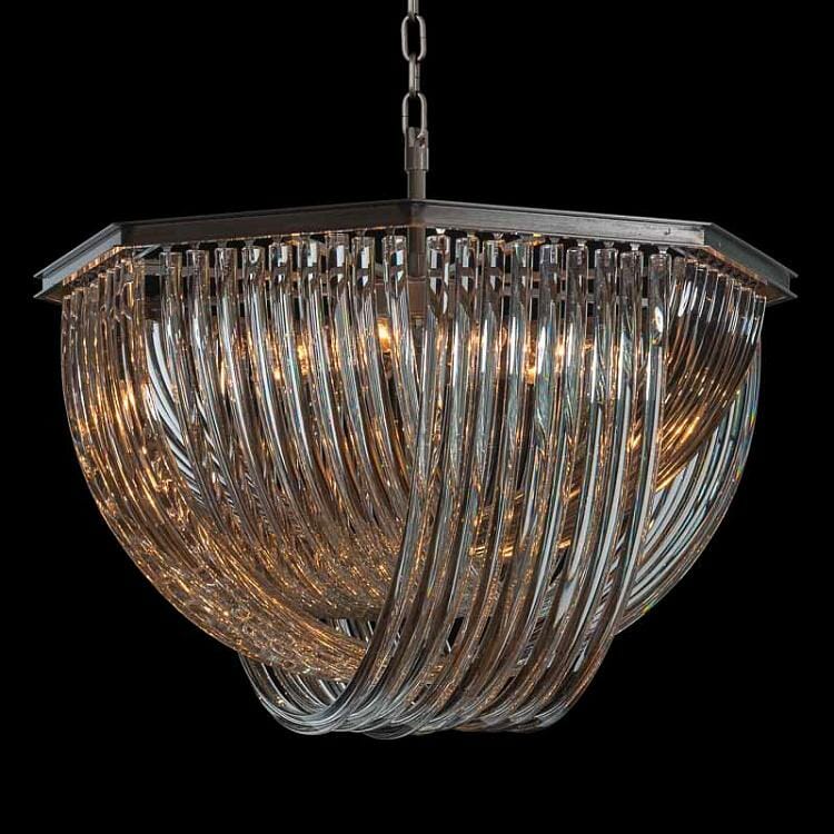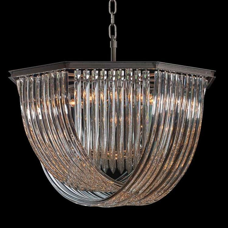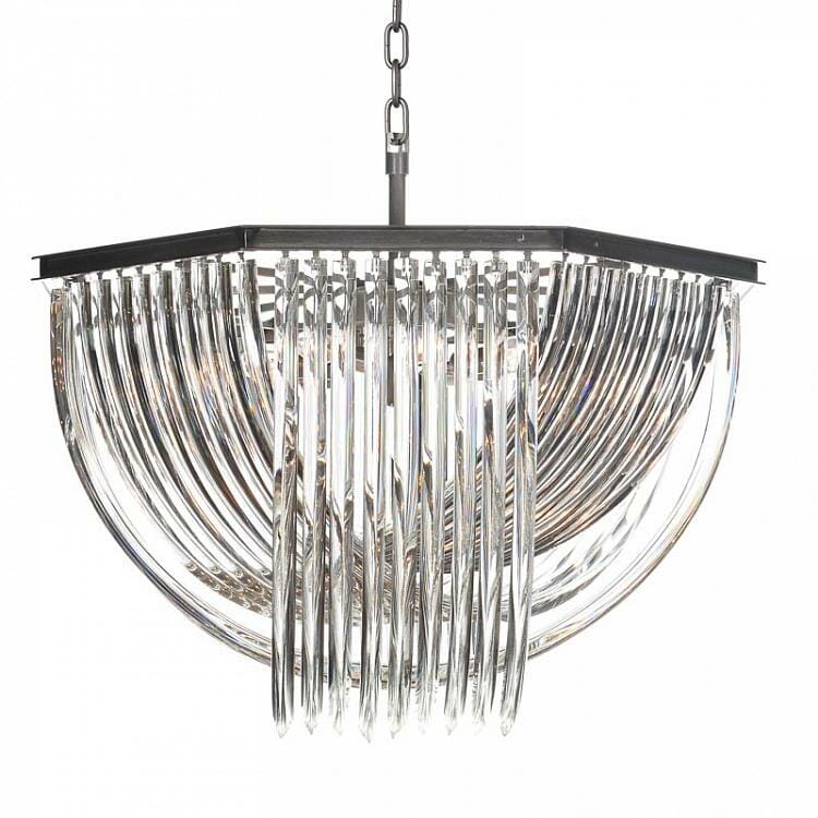Inspired by late 20th century Italian design, the powerful Crossglass pendant hanging light features sweeping arcs of crystal clear glass overlapped on an octagonal base. The curved shapes are achieved through extruding the glass through a hollow die, a process invented in the 1800s. A bold and captivating way to add sparkle and glow to a room.