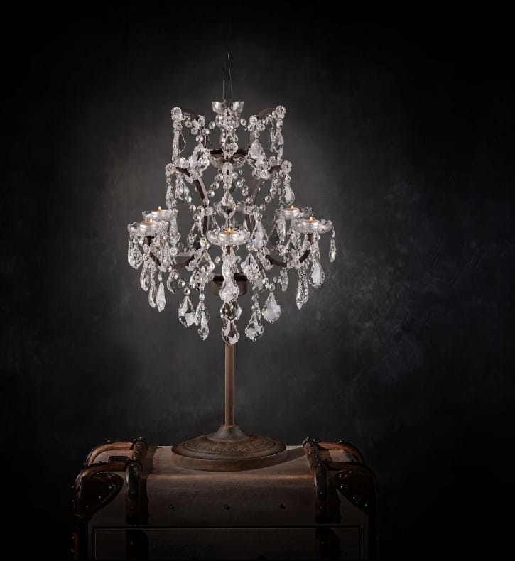 Capture the age-old romance of candlelight with this beautiful candle holder, based on the same design as our Crystal table lamp but using candles (not included) in place of bulbs. The design takes its inspiration from Georgian chandeliers and features precision cut glass crystals and bobeche dishes, contrasted with an aged metal frame in our proprietary Antique Rust finish.