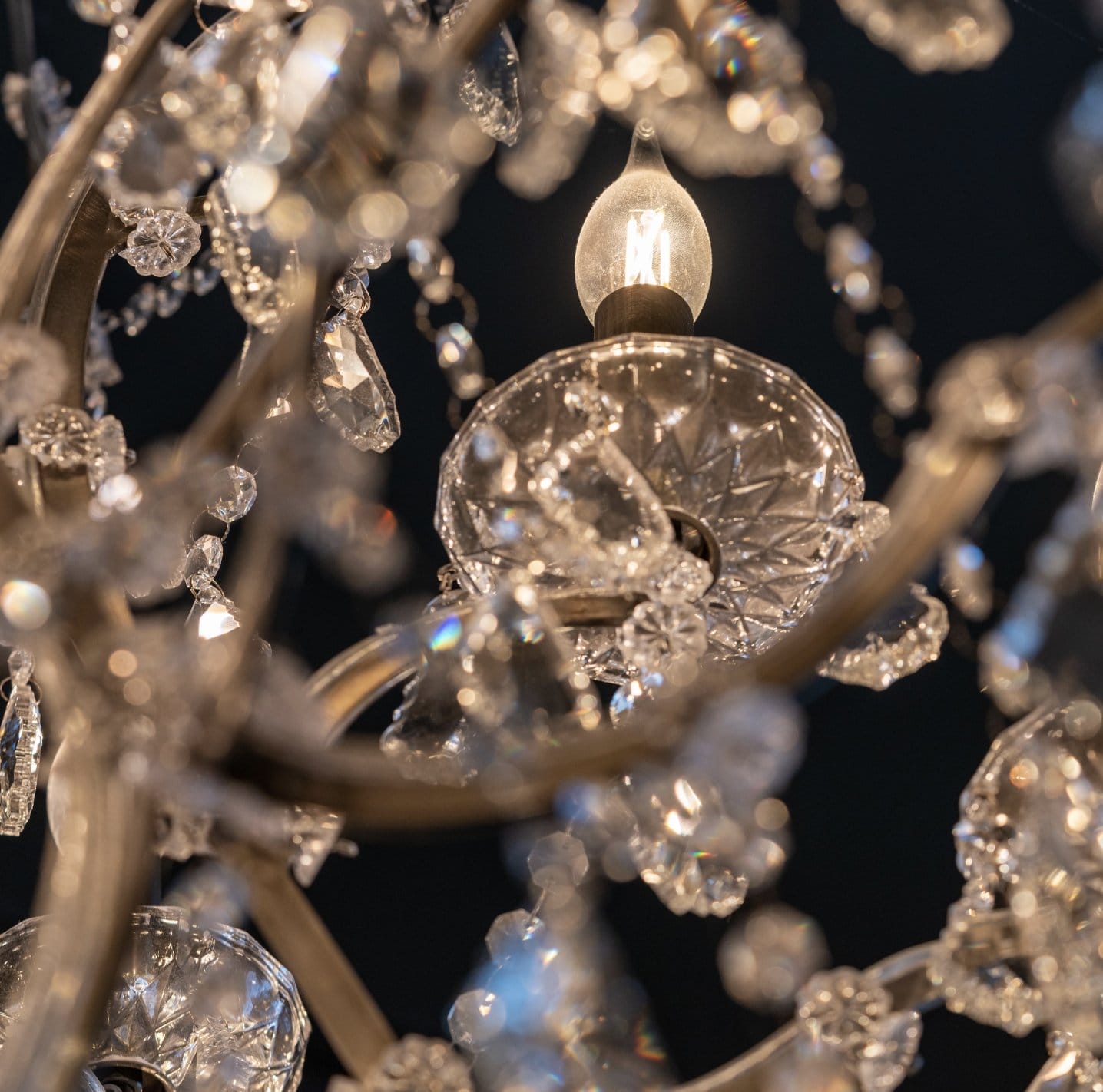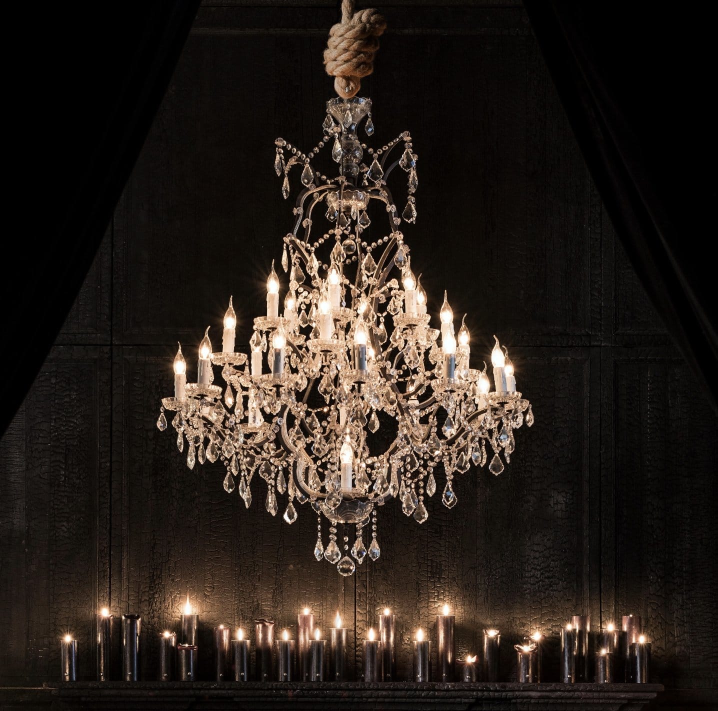 The Crystal chandelier is inspired by the elaborate designs of late Georgian era chandeliers. This handcrafted range features many hallmarks of Georgian design including large crystal baluster centrepieces, precision cut glass crystals, candle lights and corresponding bobeche dishes originally used to collect candlewax. These elaborate and romantic features are starkly contrasted with the rustic aged metal patina of our proprietary Antique Rust finish. Frame available in Antique Rust with white candleholders or Natural metal with matching natural candleholders.