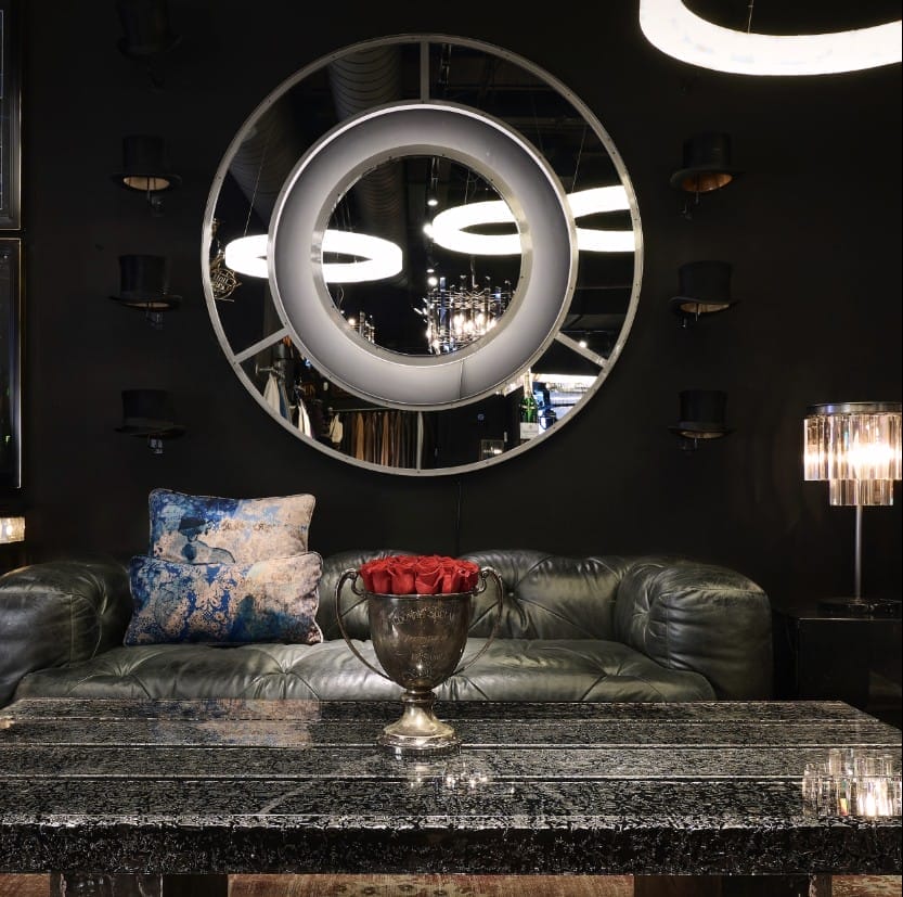 Taking its inspiration from the way sound waves reflect from a surface back to the listener, this striking mirror ‘echoes’ the light to create a dramatic floating halo. Comprised of two independent pieces – a circular backlit mirror orbited by a second mirrored hoop – Echo encompasses the wall colour in between the two mirrors as part of the design. Light travels from the central point behind the frame to illuminate the empty space, and continues behind the frame of the outer ring to create a soft peripheral glow.