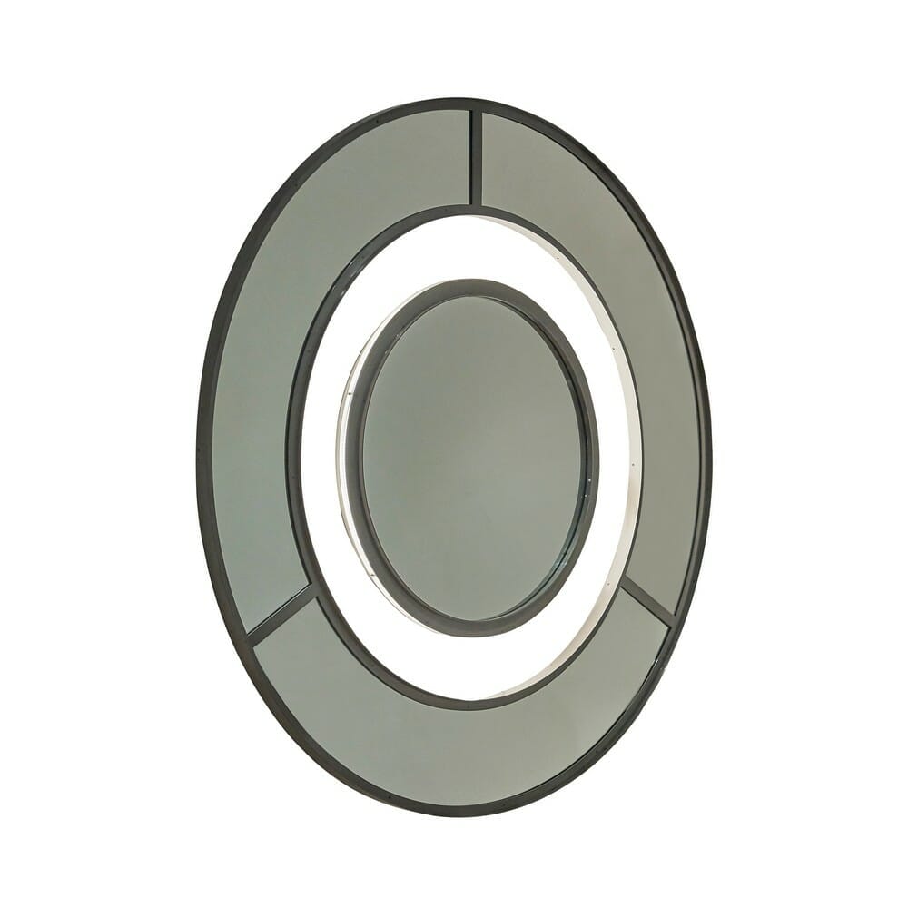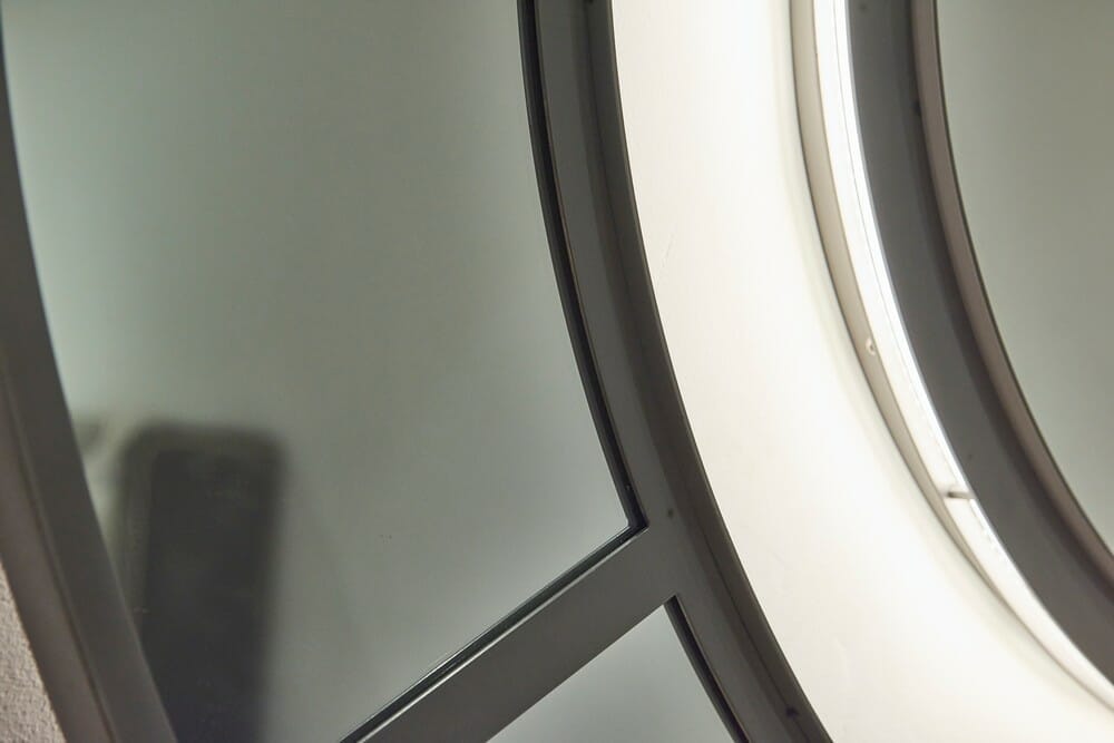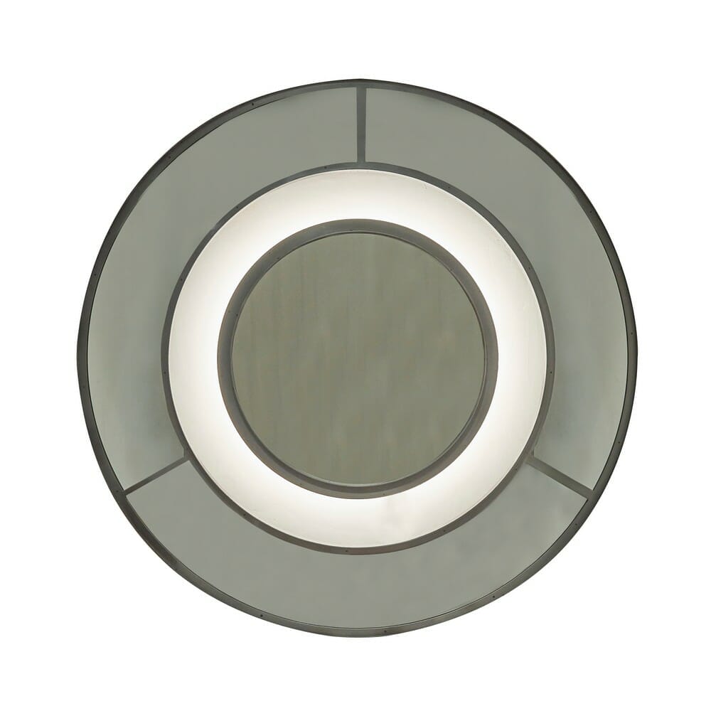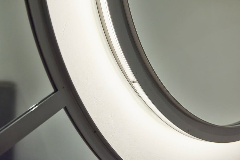 Taking its inspiration from the way sound waves reflect from a surface back to the listener, this striking mirror ‘echoes’ the light to create a dramatic floating halo. Comprised of two independent pieces – a circular backlit mirror orbited by a second mirrored hoop – Echo encompasses the wall colour in between the two mirrors as part of the design. Light travels from the central point behind the frame to illuminate the empty space, and continues behind the frame of the outer ring to create a soft peripheral glow.