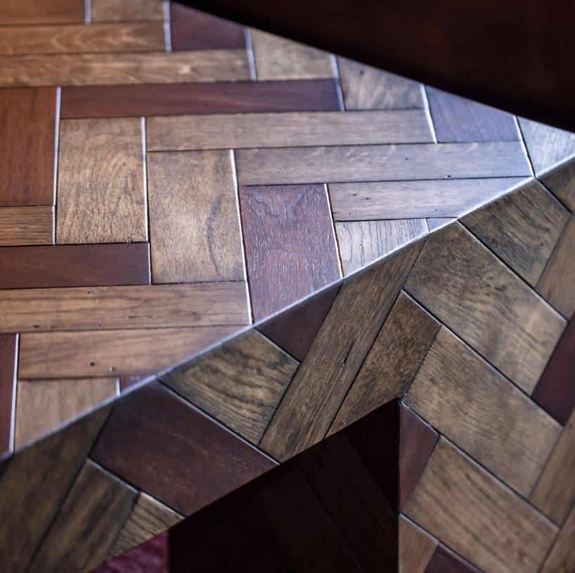 The striking Edwardian desk is fashioned from reclaimed parquetry oak. Originally forming the floors of Edwardian dancehalls and other buildings in the UK, the timber is over 100 years old, bringing a century of history and character into your home. The reclamation of the wood is a long and arduous journey; each block is carefully removed by hand and cleaned before making its way to our workshop, where craftsmen use meticulous skill to lay each block – by hand – into the distinctive chevron pattern, creating a rustic surface full of personality and charm.