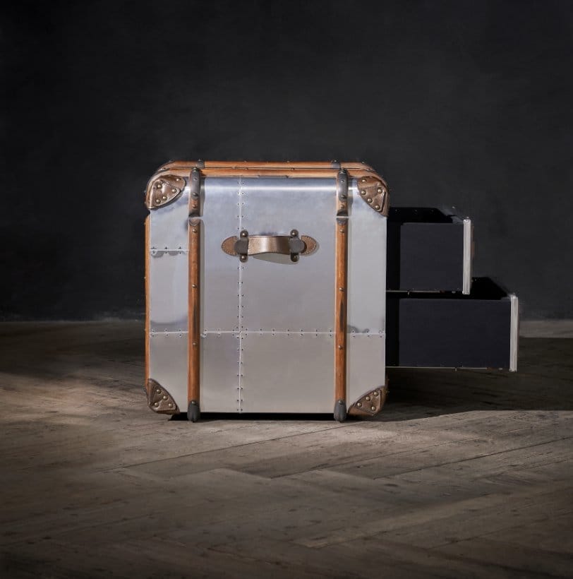 Harking back to the romantic era of long, luxurious voyages by sea, our signature Globetrekker range is inspired by an original trunk that Tim Oulton discovered at an antiques market. According to the brass plate mounted above the latch, the trunk had been presented to a Mr Tom Richards on 26 November 1914 as he set off on his journey from the UK to South Africa. The canvas of the original trunk has been updated in Timothy Oulton’s Aero and Vellum finishes but authentic details from Tom Richard’s trunk were preserved, including the hand-curved wood banding, vintage-style hardware, and even the name plaque.
