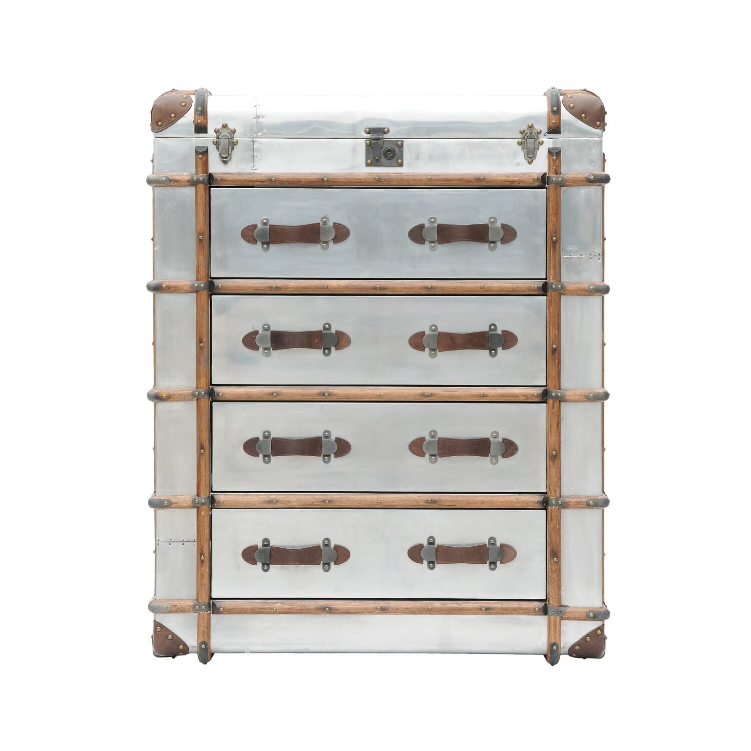 Harking back to the romantic era of long, luxurious voyages by sea, the Globetrekker range is inspired by an original trunk from 1914 that Timothy Oulton discovered at an antiques market. Intrigued by the intricate detailing and beautiful brass plate of the trunk, Tim deconstructed the antique, redesigning it to encompass a full collection of lamp tables, chests, coffee tables, and bookcases, evolving with a range of different innovative finishes. Globetrekker has a distressed aluminium finish inspired by military aircraft, transporting the original Globetrekker into the dynamic, modern world of travel.