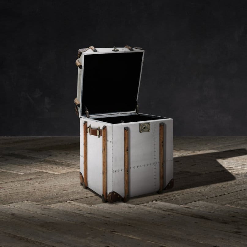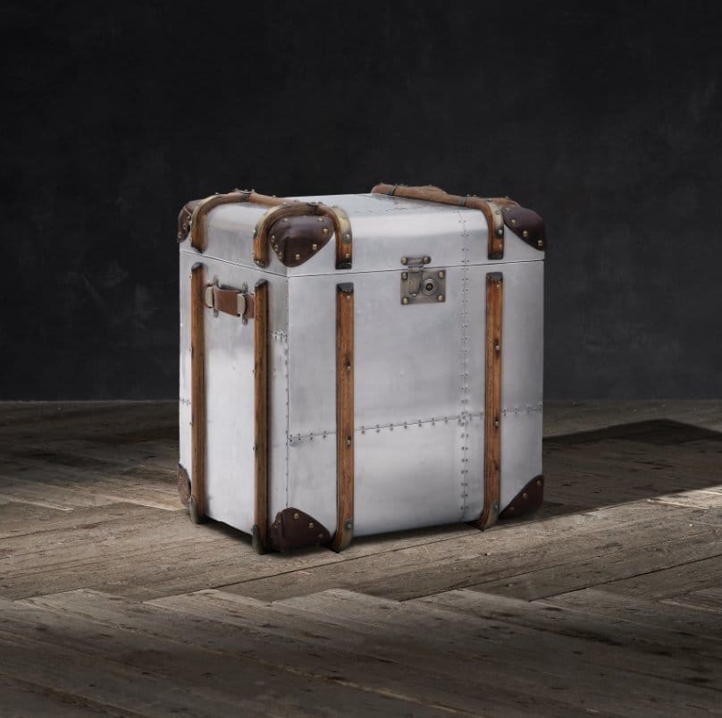 Product ID: Harking back to the romantic era of long, luxurious voyages by sea, our signature Globetrekker range is inspired by an original trunk that Tim Oulton discovered at an antiques market. According to the brass plate mounted above the latch, the trunk had been presented to a Mr Tom Richards on 26 November 1914 as he set off on his journey from the UK to South Africa. The canvas of the original trunk has been updated in Timothy Oulton's Aero and Vellum finishes but authentic details from Tom Richard's trunk were preserved, including the hand-curved wood banding, vintage-style hardware, and even the name plaque.