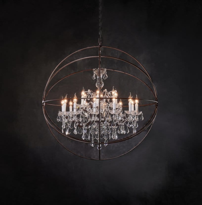 The Gyro Crystal chandelier is inspired by nineteenth century experimental physicist Leon Foucault’s gyroscope. A framework of aged metal spheres is fixed around a traditional Georgian style chandelier, colliding industrial accents with romance and glamour.