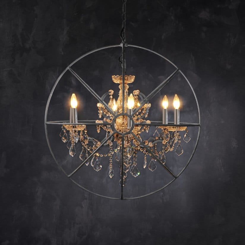 The Gyro Crystal chandelier is inspired by nineteenth century experimental physicist Leon Foucault’s gyroscope. A framework of aged metal spheres is fixed around a traditional Georgian style chandelier, colliding industrial accents with romance and glamour. These elaborate and romantic features are starkly contrasted with the rustic aged metal patina of our proprietary Antique Rust finish.