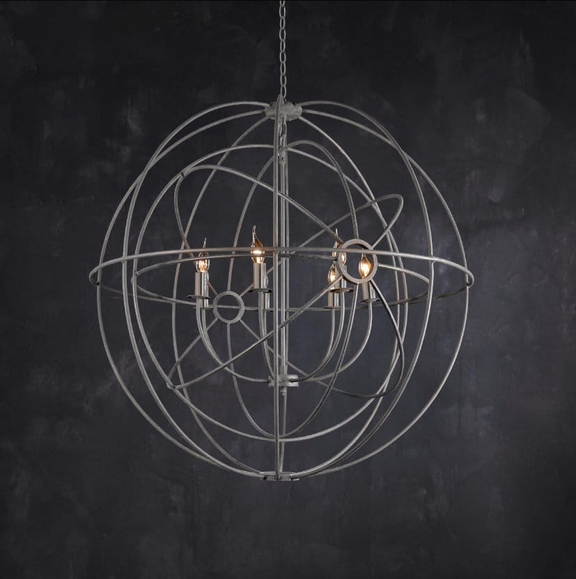The Gyro pendant is inspired by nineteenth century experimental physicist Leon Foucault’s gyroscope: a device used for measuring orientation. Extracting key elements from the historical instrument such as its multiple axes, the gyroscope has been reinterpreted into a framework of aged metal spheres fixed around a nucleus of candle lights.