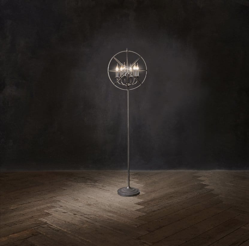 The Gyro floor lamp is inspired by nineteenth century experimental physicist Leon Foucault’s gyroscope: a device used for measuring orientation. Extracting key elements from the historical instrument such as its multiple axes, the gyroscope has been reinterpreted into a framework of aged metal spheres fixed around a nucleus of candle lights.
