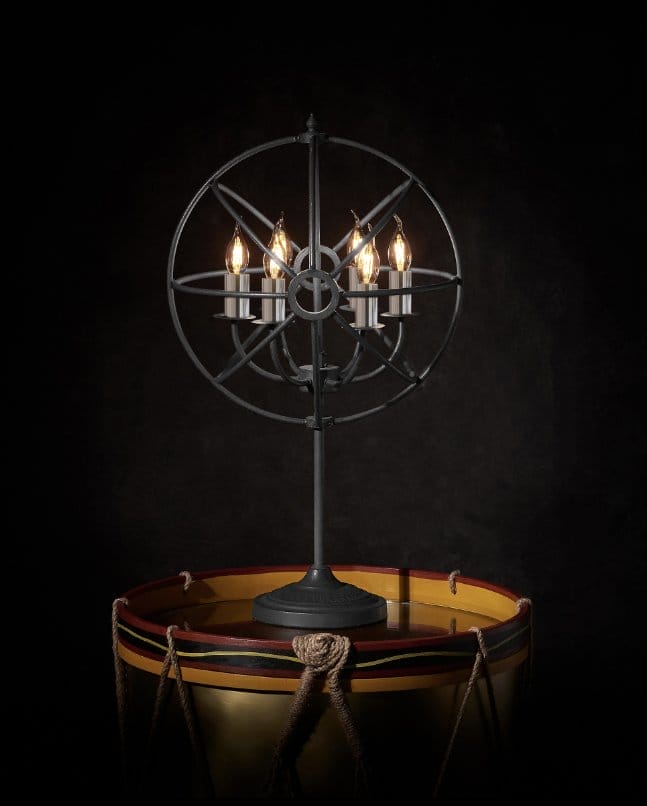 The Gyro table lamp is inspired by nineteenth century experimental physicist Leon Foucault’s gyroscope: a device used for measuring orientation. Extracting key elements from the historical instrument such as its multiple axes, the gyroscope has been reinterpreted into a framework of aged metal spheres fixed around a nucleus of candle lights.