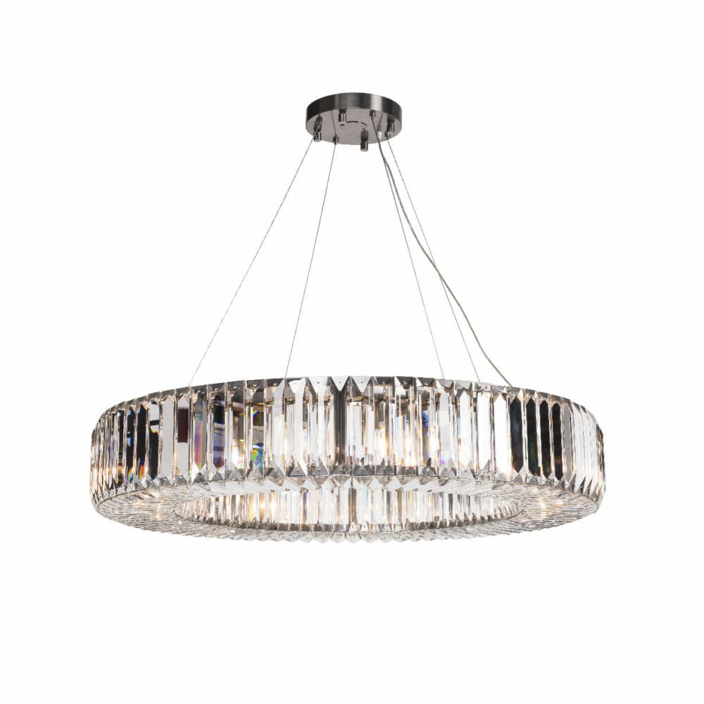Named after the Roman king, Herod the Great, the Herodes pendant is grandiose in both stature and drama. This spectacular floating halo of sparkle and shimmer is handcrafted from a circular iron frame, covered completely by tightly packed rows of prismatic baguettes. Each prism is made from optical grade glass, clearer and lighter than crystal, theatrically bouncing the light in every direction for show-stopping glamour.