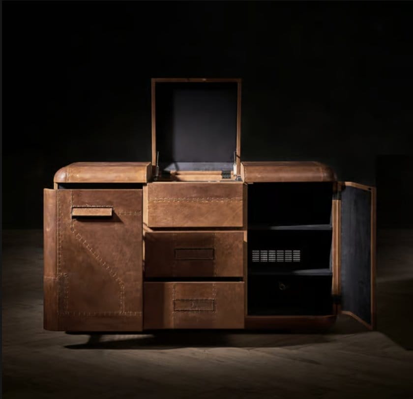 The sensorial Hudson collection houses everything you need for a great night in, whatever the occasion. Understated design adds to its stealth, but its rich textured surface cloaked in a patchwork of Fury leather panels, hints at something special within. The Hudson sideboard has pull-out wire racks for your glassware, two drawers and a cupboard with removable shelf, keeping you fully stocked for your guests. The lift-up middle section also reveals an ice bucket inside, so you’ll have everything to hand to shake up a storm.