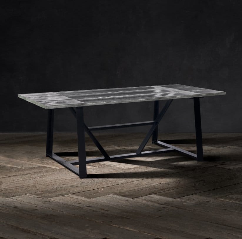 Encapsulating the elemental power of ice through its strong architectural aesthetic, the Iceberg dining table floats three sleek glass planks atop a rigid steel frame. The glass has been cast with a unique rippled texture to evoke frozen blocks of water. Each plank has a smooth underside, and can simply be carefully lifted and turned if preferred. Small white markings may appear within the grooves of the rippled side, this is a characteristic of the glass and part of the design.