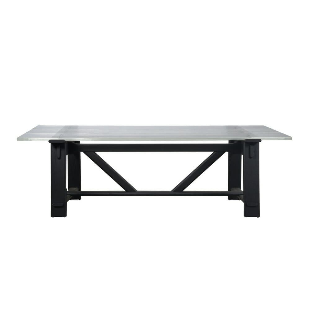 The Iceberg dining table’s minimal lines encapsulate the elemental power of ice. Three transparent glass planks, evoking sleek, frozen blocks of water, float atop a rigid black steel frame. Each plank can simply be lifted and turned, choosing from a unique wave-like texture on one side or a smooth, pure finish on the reverse. Carefully crafted, thought-out details for modern entertaining. Special note: Small white markings may appear within the grooves of the rippled side, this is a characteristic of the glass and part of the design. Two people are recommended to carefully turn the glass planks if desired.