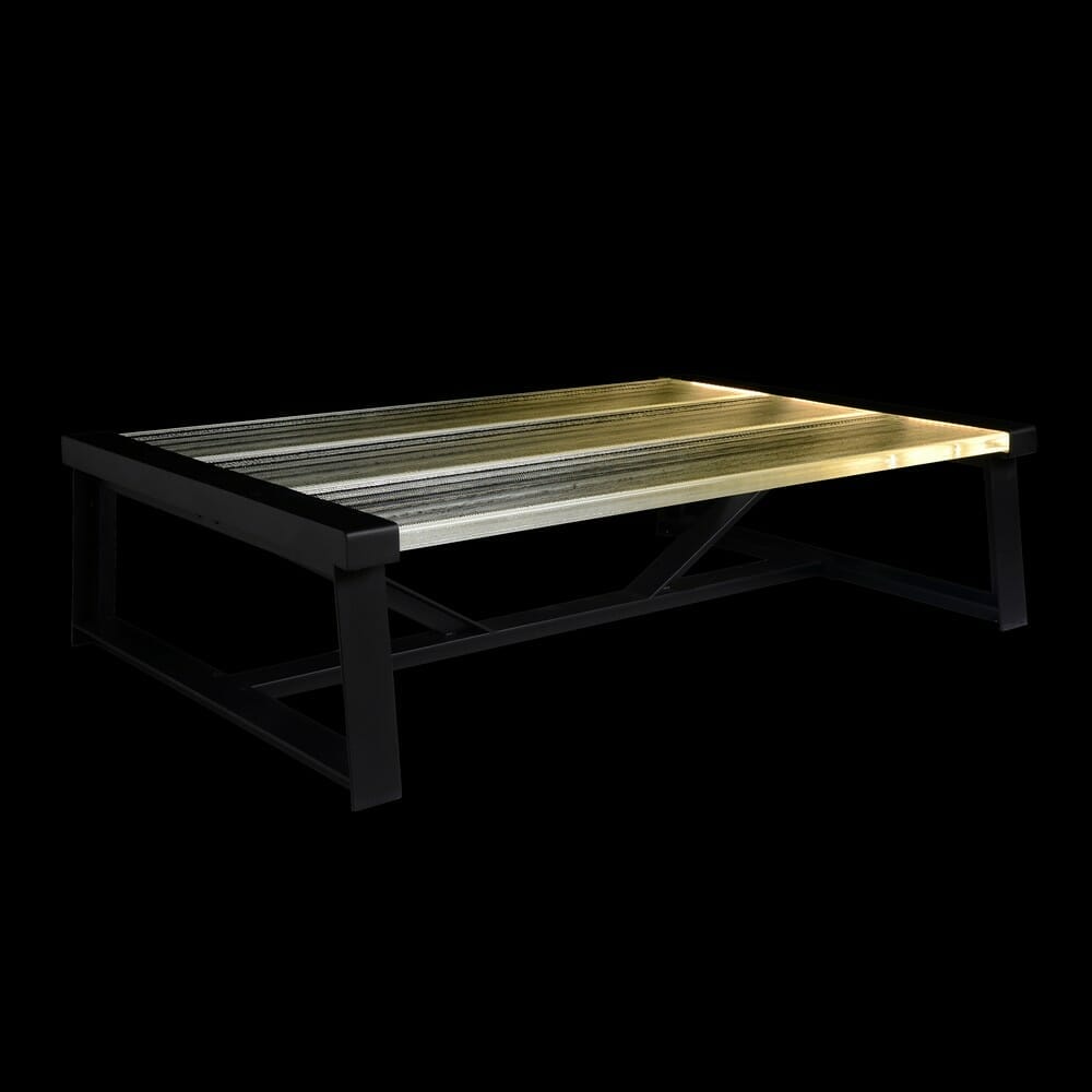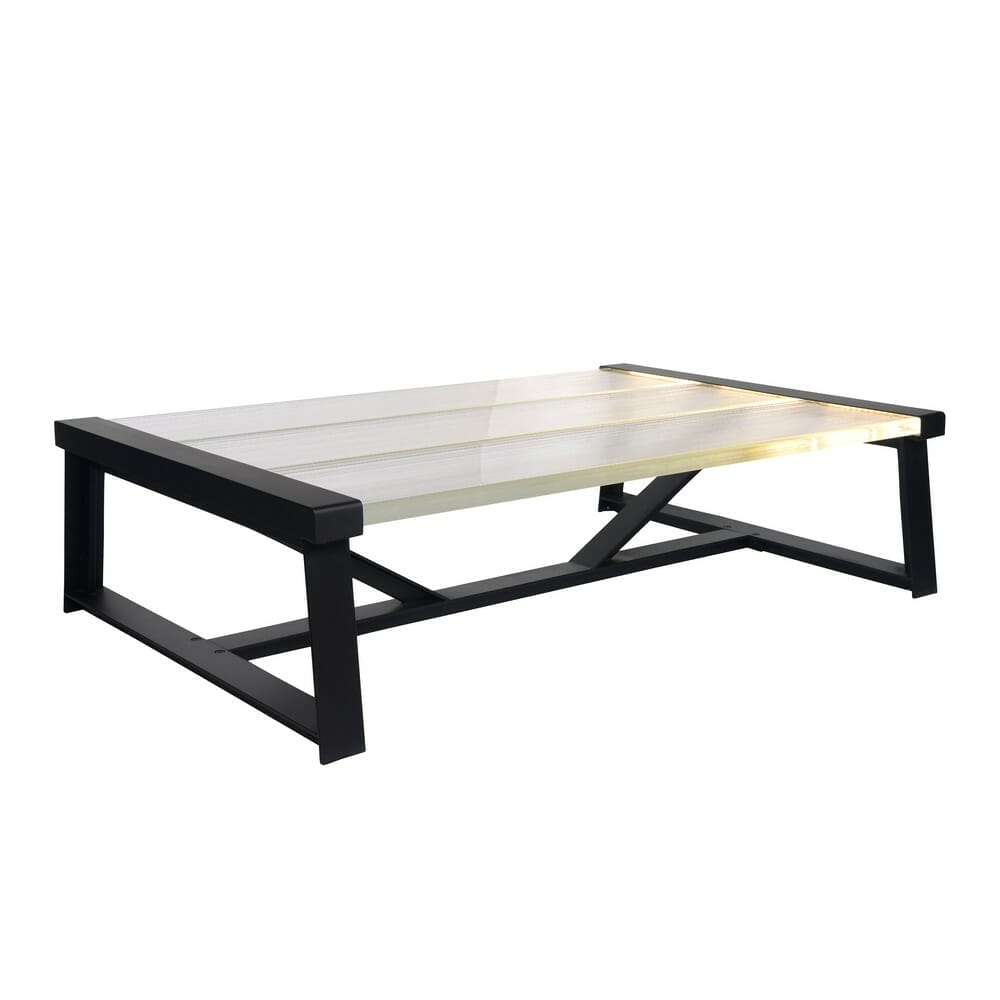 Glistening planks of ice float atop a rigid black steel frame in the Iceberg Glow coffee table. Each sleek, icy plank is crafted in clear glass with a subtle wave-like texture, illuminated at the edges to cast a soft and romantic glow. A contemporary, architectural piece that encapsulates the elemental power of nature, perfect for modern entertaining.