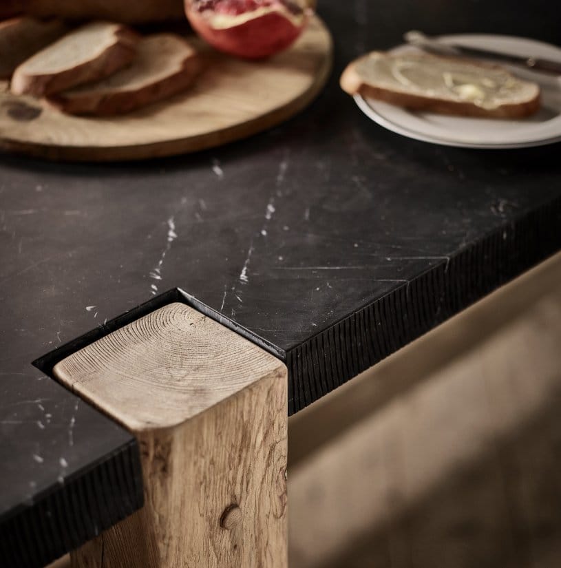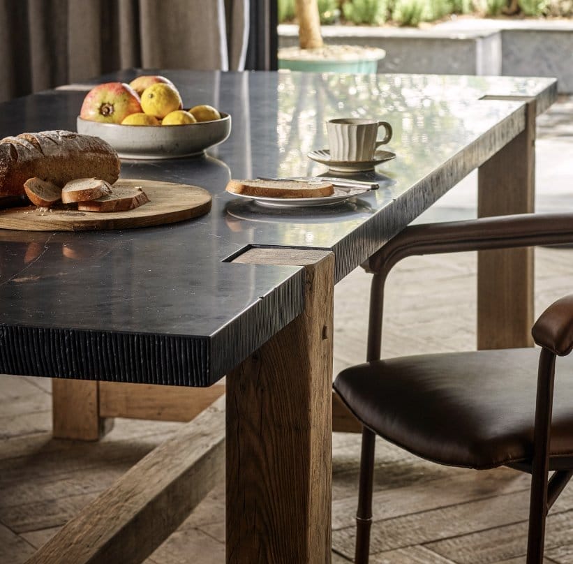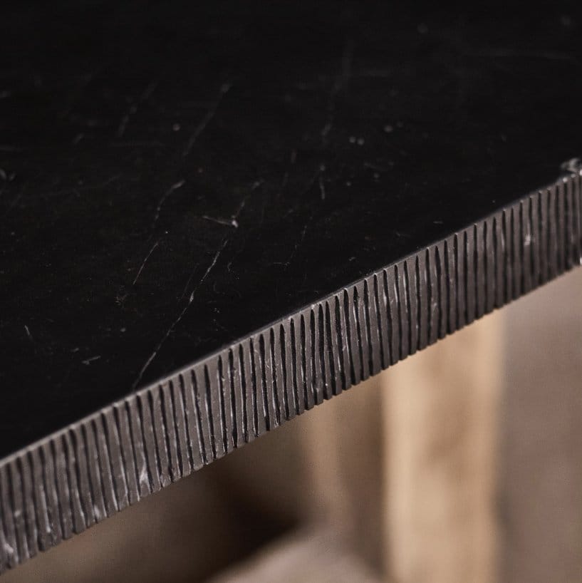 Taking its name from the Latin word for ‘unconquerable’, the Invictus dining table’s heroic form contrasts mighty oak with a luxuriously thick plane of marble. Vertical lines have been hand-chiselled along the entire peripheral edge of the marble, playing with texture and contrast. Our craftsmen then chip the edge in places using simple tools, to further create the look of an age-old table.