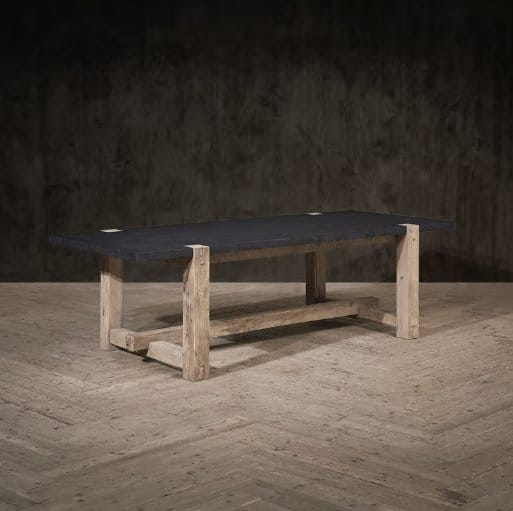 The reclaimed oak is around 100 years old, salvaged from old houses and rife with the character that only weathering and age can bring. Its provenance is lovingly preserved in the dowels, holes, nail heads, cracks, and splits present in the wood. Enduring mortise and tenon joinery is used to construct the timeless silhouette, a technique that has been used in woodwork for thousands of years.