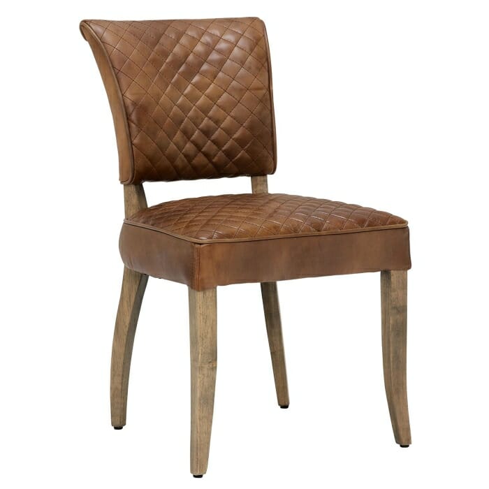 Quilted leather is a classic, from English country jackets to motorbike leathers to vintage bags. The Mimi Quilt dining chair reinvents a classic 1940s French piece, richly clad in quilted hand-softened leather for a modern, textured look. With brass stud detailing and tapered wooden legs, this timeless style has a gently flared back and padded seat for added comfort, so you can chat for hours over dinner with friends.