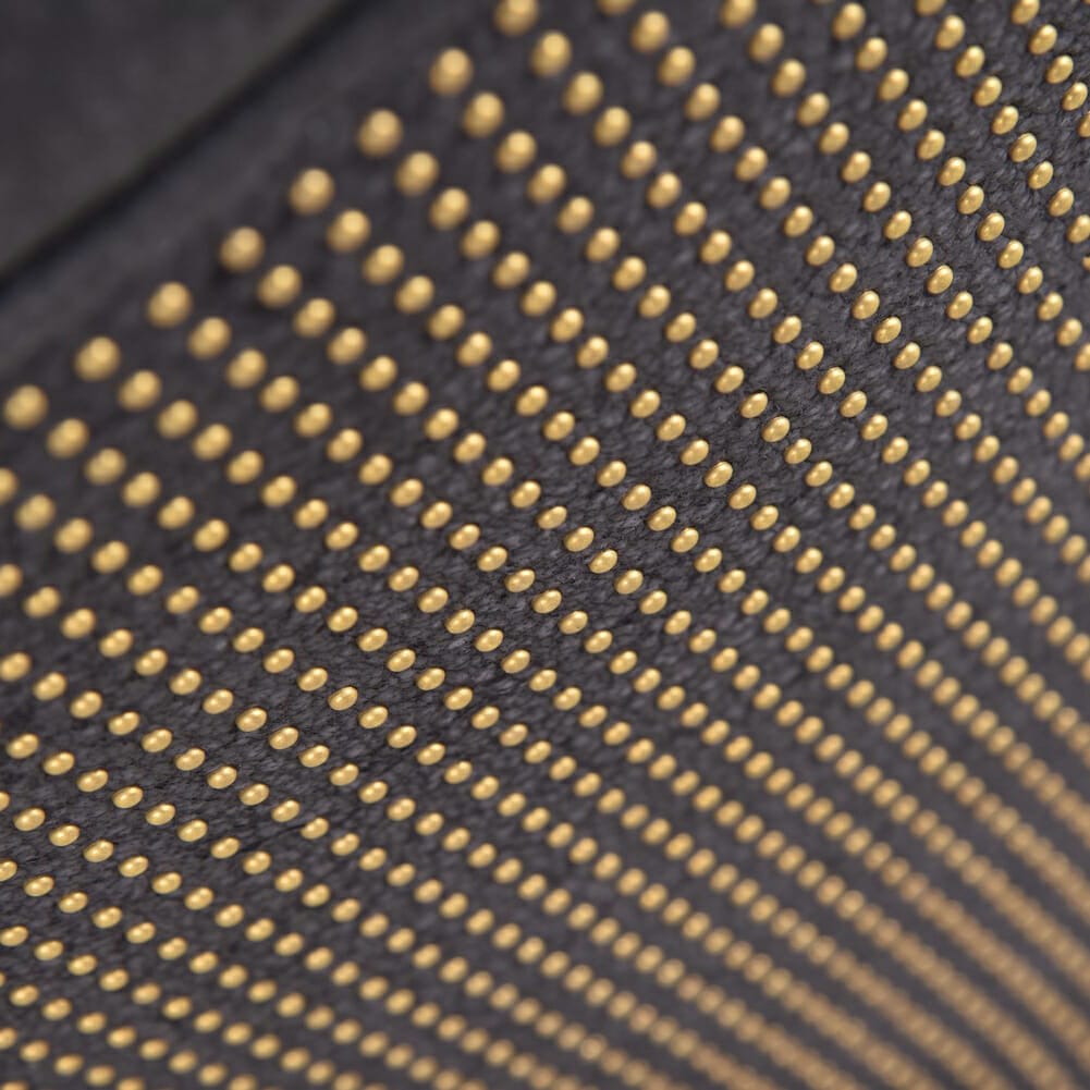 With its edgiest look to date, the classic Mimi dining chair goes punk in studded leather. The seat and front is clad in Safari Black, a truly rugged leather with a natural, lived-in patina and a dry texture, almost like suede, complemented by black chair legs. Brass-studded Safari leather covers the back of the chair, with piped detailing around the edge for a more tailored feel. With a flared back and generously padded seat for comfort, Mimi Stud merges classic styling with an audaciously modern take on glamour. Available with or without arms.