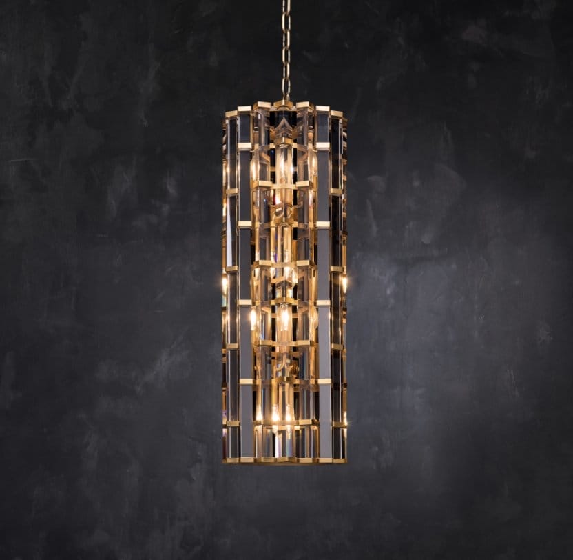The glamorous Night Rod pendant is inspired by unexpected flashes of light in the night. Long prisms of optical grade glass are held tightly together in a staggered effect, within a skeleton of plated bronze metal. The triangular shape of the prisms reflects and refracts the light on all sides in a shimmering dance of sparkle.