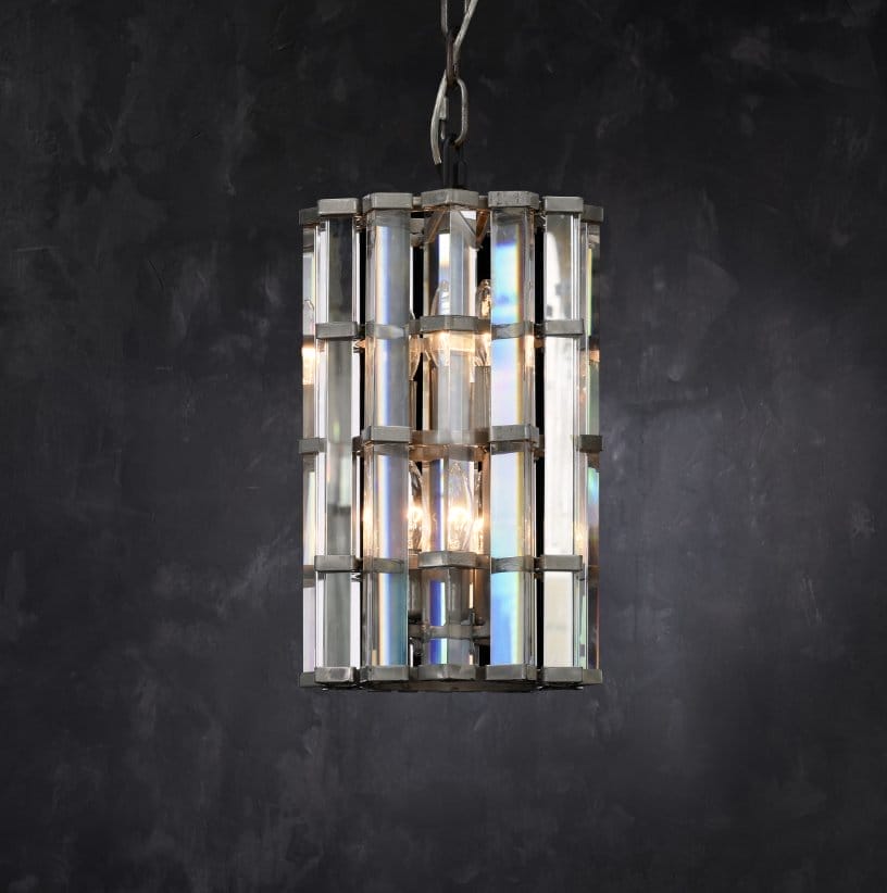 The glamorous Night Rod pendant is inspired by unexpected flashes of light in the night. Long prisms of optical grade glass are held tightly together in a staggered effect, within a skeleton of either plated bronze or natural metal. The triangular shape of the prisms reflects and refracts the light on all sides in a shimmering dance of sparkle.