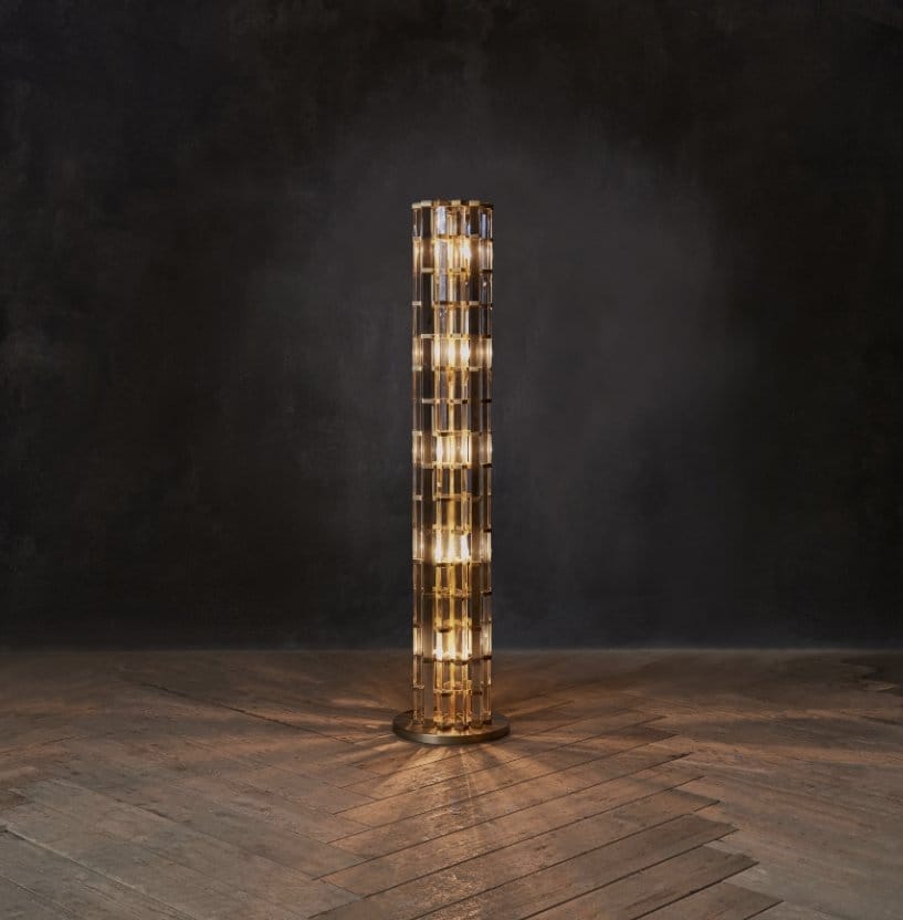 The glamorous Night Rod floor lamp is inspired by unexpected flashes of light in the night. Long prisms of optical grade glass are held tightly together in a staggered effect, within a skeleton of plated bronze metal. The triangular shape of the prisms reflects and refracts the light on all sides in a shimmering dance of sparkle.