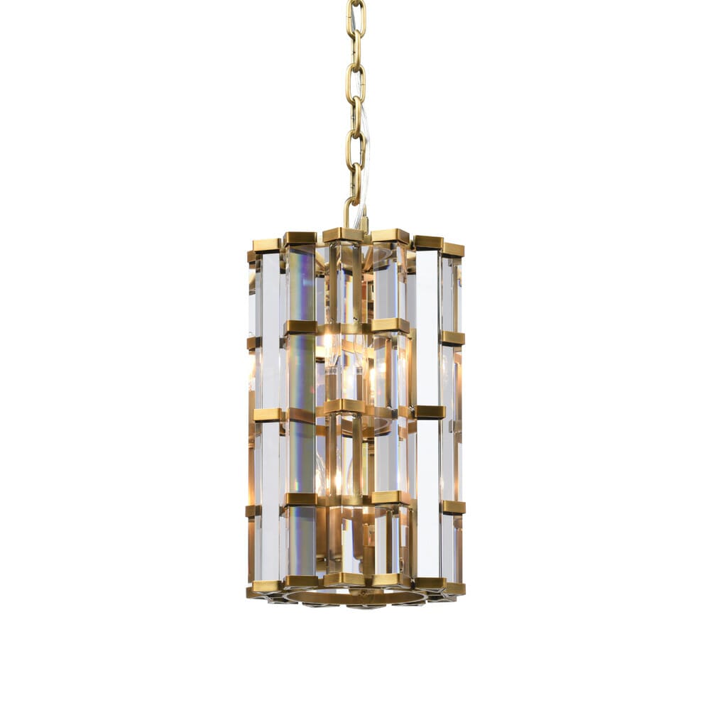 The glamorous Night Rod collection offers dramatic lighting for elegant urban spaces. Long prisms of optical grade glass are held tightly together in a staggered effect, within a skeleton of either plated bronze or natural metal. The triangular shape of the prisms reflects and refracts the light on all sides in a shimmering dance of sparkle.