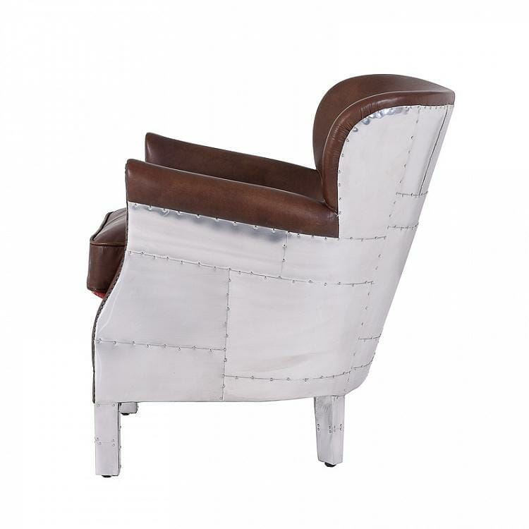A Timothy Oulton classic, the Professor chair offers amazing comfort due to its clever contouring. The smaller proportions work perfectly in any entry hall or bedroom. The Professor Spitfire contrasts luxuriously soft hand-finished leather with the ruggedness of riveted aluminium panels, inspired by the World War II Spitfire fighter plane. The seat cushion of the Professor Spitfire chair is upholstered in vibrant woven Kilim on the reverse side. Please note, the Spitfire finish features surface distress variations, which may vary from piece to piece.
