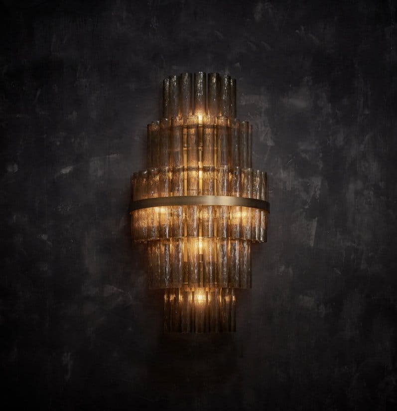 Epically beautiful, the Puzo wall sconce stands at a grandiose height of between five and seven feet tall, with the largest size weighing almost 100kgs. Taking inspiration from mid-century Murano glass lighting, Puzo epitomises the power, opulence and glamour of 1960s Italian design, infused with a heavy dose of la dolce vita. Crafted from hand-blown tubes of textured glass in a smoky finish, with either bronze or natural metal banding around the central tier.