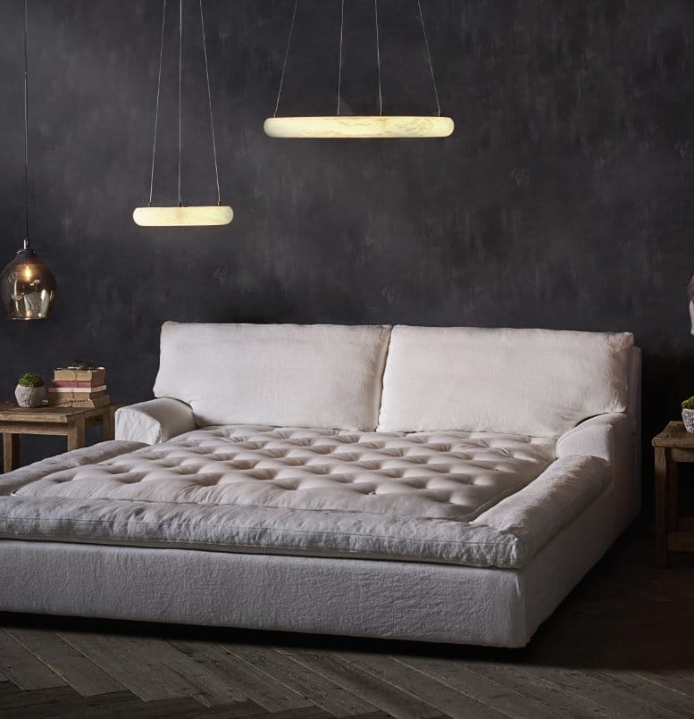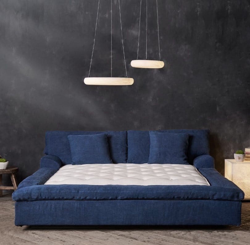 An intimate zone for reconnecting, the Realm bed offers disarming sink-in comfort. Layers of back cushions are filled with a new, innovative, ultra-light fibre which feels exactly like feathers. Manoeuvre the cushions into your perfect position for bedtime reading, before drifting serenely off to sleep. Realm floats on a black fabric base and is swathed in the same natural textiles as our Noble Souls sofas, coloured using 100% natural vegetable dyes, applied by hand using simple tools and time honoured techniques. Covers are removable for cleaning.
