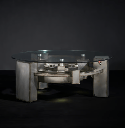he Rev collection is inspired by the machine elements of the motorcycling and automotive world, displaying the contrast between the refined and the raw power they possess. The refinement comes from the intricacy and precision of thousands of moving components, synchronised in perfect harmony in a finely orchestrated composition, that then produces the aggressive rumble and raw power which leaves a trail of burnt rubber and a smell of ignited oil in its aftermath. This is the feeling portrayed by the Rev collection, with the giant gears and concentric ring configurations embodying the movement of machine parts. The raw steel in a matt finish coupled with exposed weld marks reflects the authentic craftsmanship in each piece’s fabrication.