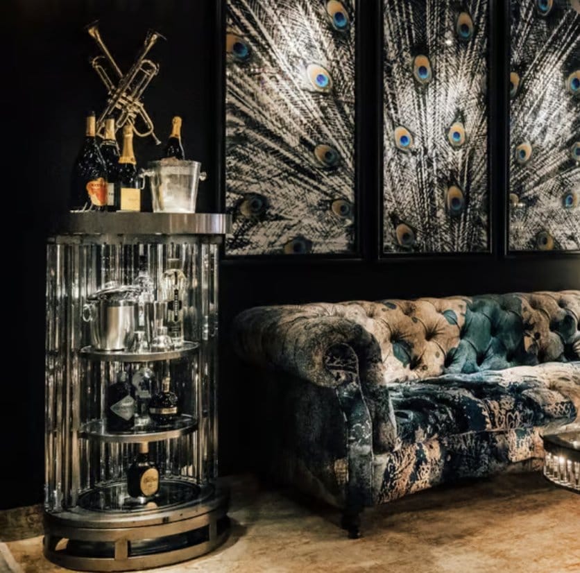 Swirl your senses with the show-stopping Rex collection. Strongly directed by Art Deco influences, Rex recaptures the magic and romance of glamour’s golden age. The collection shares its name with the historic Rex cinema in England; a 1930s Art Deco gem boasting a beautiful auditorium with dramatic lighting. Saved from dereliction by a local entrepreneur, the cinema was restored to its former glory in 2004. The Rex Biohazard bar cabinet juxtaposes a natural metal frame with glowing prisms of glass, refracting the light in a perpetual dance of shimmer and sparkle. Vintage glamour, recast for today.