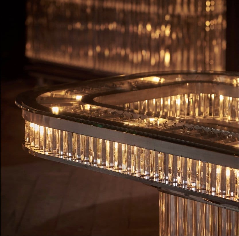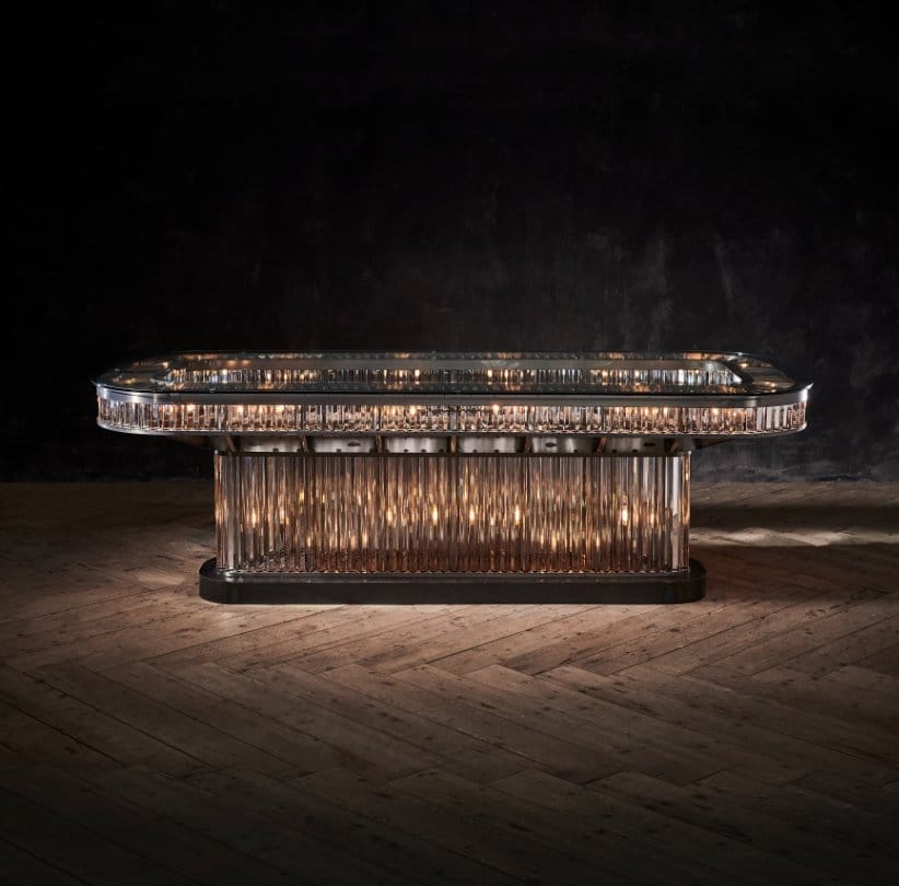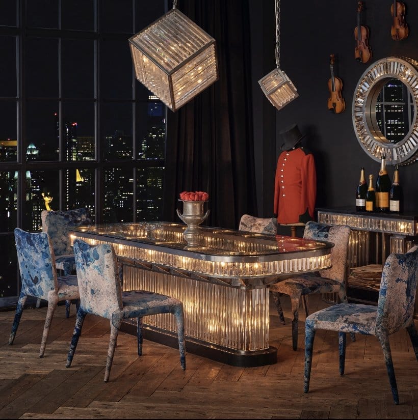 Swirl your senses with the show-stopping Rex collection. Strongly directed by Art Deco influences, Rex recaptures the magic and romance of glamour’s golden age. The collection is inspired by the historic Rex cinema in England; a 1930s Art Deco gem boasting a beautiful auditorium with dramatic lighting. Saved from dereliction by a local entrepreneur, the cinema was restored to its former glory in 2004. The Rex rectangular dining table juxtaposes its raw iron frame with 550 glowing prisms of optical grade glass, refracting the light in a perpetual dance of shimmer and sparkle. Vintage glamour, recast for today.