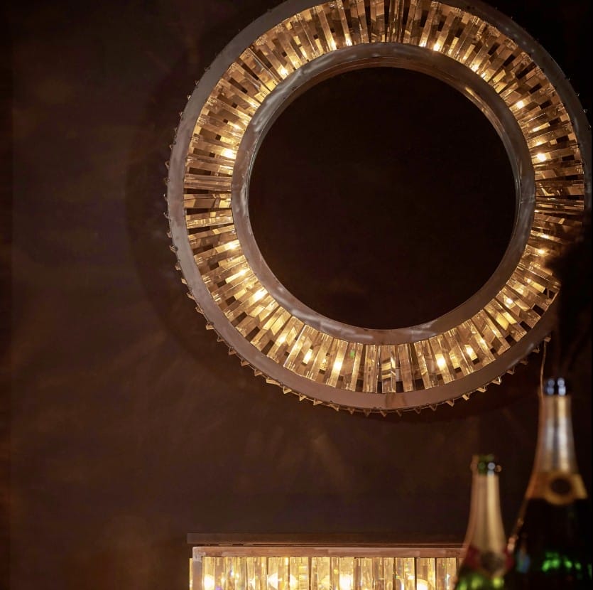 Swirl your senses with the show-stopping Rex collection. Strongly directed by Art Deco influences, Rex recaptures the magic and romance of glamour’s golden age.The collection is inspired by the historic Rex cinema in England; a 1930s Art Deco gem boasting a beautiful auditorium with dramatic lighting. Saved from dereliction by a local entrepreneur, the cinema was restored to its former glory in 2004. The Rex mirror juxtaposes its raw iron frame with glowing prisms of optical grade glass, refracting the light in a perpetual dance of shimmer and sparkle. Vintage glamour, recast for today.