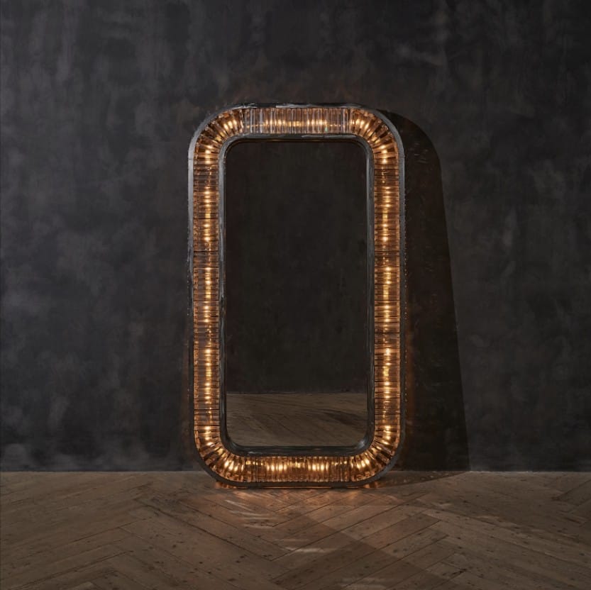 Swirl your senses with the show-stopping Rex collection. Strongly directed by Art Deco influences, Rex recaptures the magic and romance of glamour’s golden age.The collection is inspired by the historic Rex cinema in England; a 1930s Art Deco gem boasting a beautiful auditorium with dramatic lighting. Saved from dereliction by a local entrepreneur, the cinema was restored to its former glory in 2004. The Rex Mirror juxtaposes its raw iron frame with glowing prisms of optical grade glass, refracting the light in a perpetual dance of shimmer and sparkle. Vintage glamour, recast for today.
