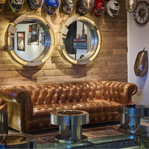 The ideology of the Rocker sofa comes from two very distinct and opposite worlds crashing together to form a perfect balance. Beginning with the Rockers, which was a sub culture that originated in the UK, based around rock ‘n’ roll music and cafe racer motorcycles. The Rockers’ motorcycling lifestyle dropped them out of mainstream society and they were branded as rebels and outsiders. At the opposite end of British society, the Chesterfield sofa was designed for upper-class gentlemen to sit without creasing their suit. These worlds come together in the Rocker sofa, contrasting the refined Chesterfield silhouette with distressed leather, emulating the scruffy and rebellious Rockers, and finished with stainless steel feet shaped like giant bolts, referencing the machine world of motorcycling.