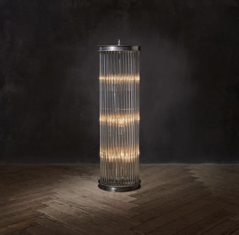 The Rod floor lamp is a modern day interpretation of Venetian Murano brass and glass library lights from the 1940s. Softly illuminated from within, this unique design creates a mellow ambience, perfect for relaxing or entertaining guests. The glass rod structure is inspired by the colonnades of Stowe School, which made a huge impression on Tim during a visit for an away game in his school days. The dazzling opulence of the glass is daringly contrasted with our natural raw iron finish, bearing the marks of the welder’s torch for a modern, industrial take on elegance.