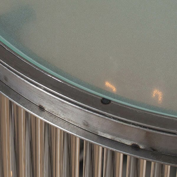 The Rod collection is a modern day interpretation of Venetian Murano brass and glass library lights from the 1940s. Softly illuminated from within, this unique design creates a mellow ambience, perfect for relaxing or entertaining guests. The glass rod structure is inspired by the colonnades of Stowe School, which made a huge impression on Tim during a visit for an away game in his school days. The dazzling opulence of the glass is daringly contrasted with our natural raw iron finish, bearing the marks of the welderメs torch for a modern, industrial take on elegance.
